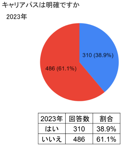 「自身のキャリアパスは明確ですか」という質問に対して、「はい」と答えた従業員は全体の38.9%であり、思わしくない結果となった。