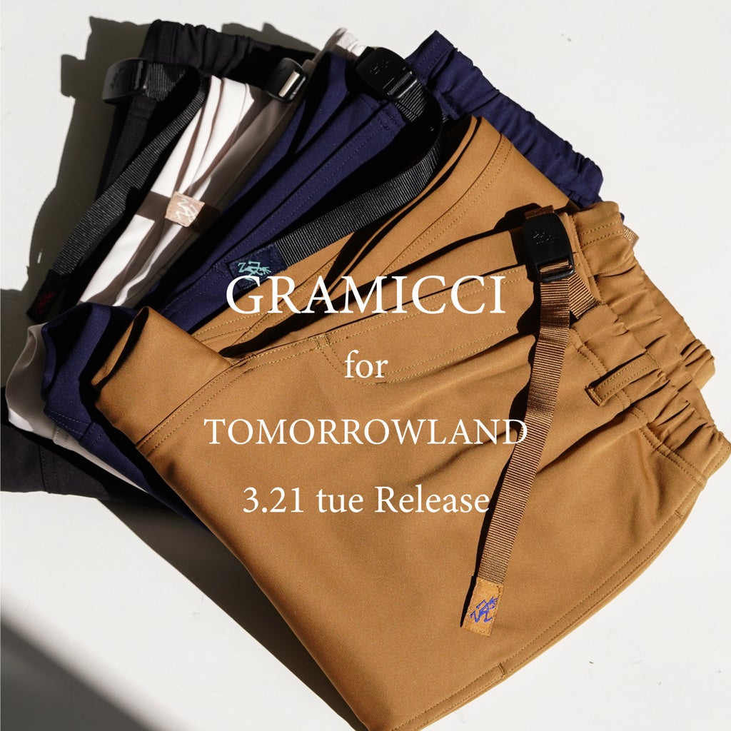 3月21日(火)より、クライミングパンツの代名詞である〈GRAMICCI〉との別注品〈GRAMICCI for TOMORROWLAND〉がリリース。