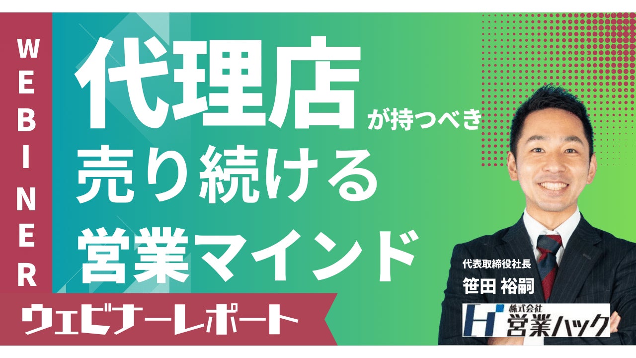 今回のテーマは「代理店営業の営業ノウハウ」。代理店営業には他の営業とは違い、顧客ニーズに合わせて複数商材を組み合わせで販売できるというメリットが存在します。そのメリットを活かした営業のポイントを、営業支援会社として100社以上の支援をしてきた営業ハックが30分のショートウェビナーでお伝えしました!