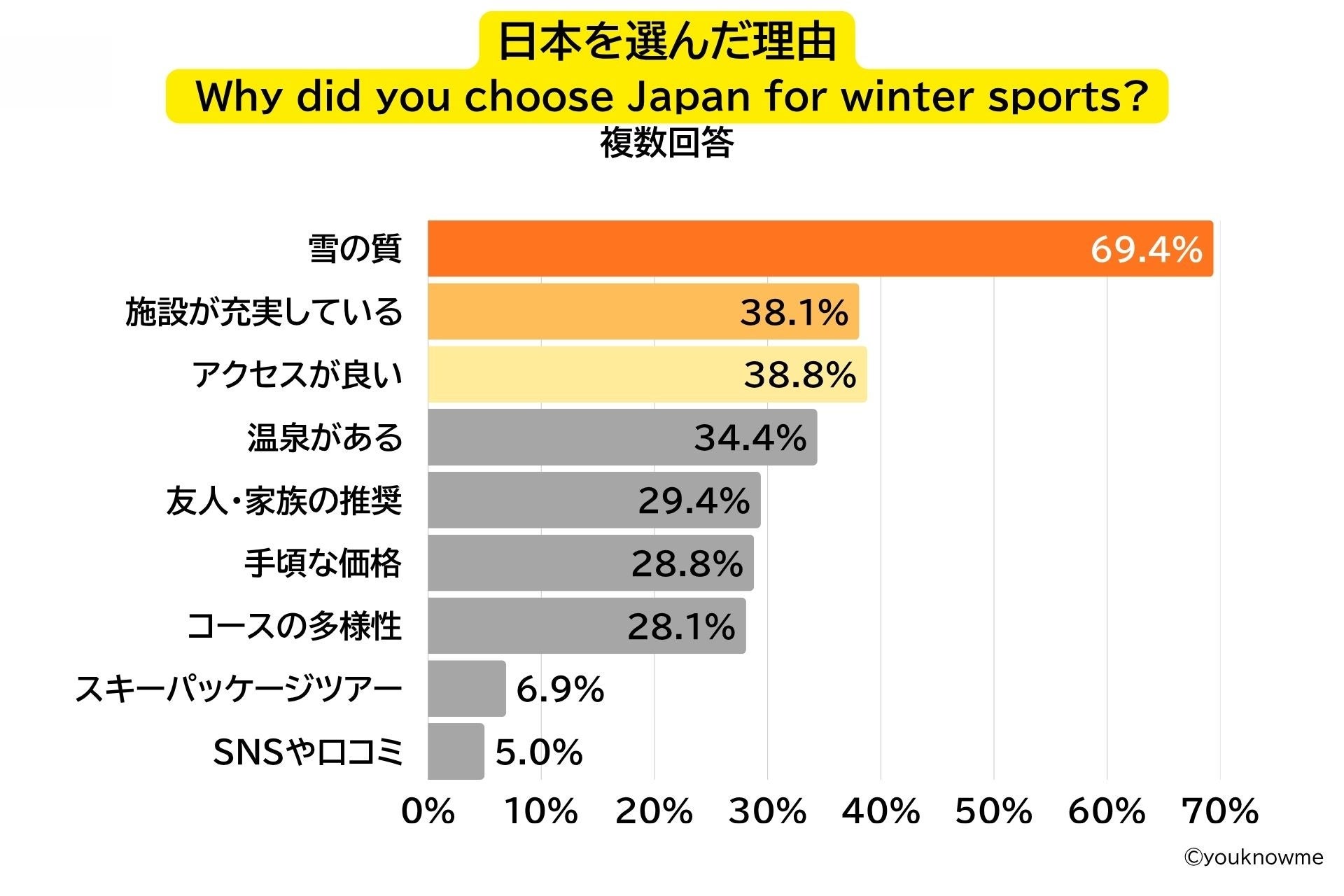 ウィンタースポーツのための旅行先として日本を選んだ理由を問う設問では、「雪の質」が69.4%と最多の回答となり、2位以下を大きく引き離しています。