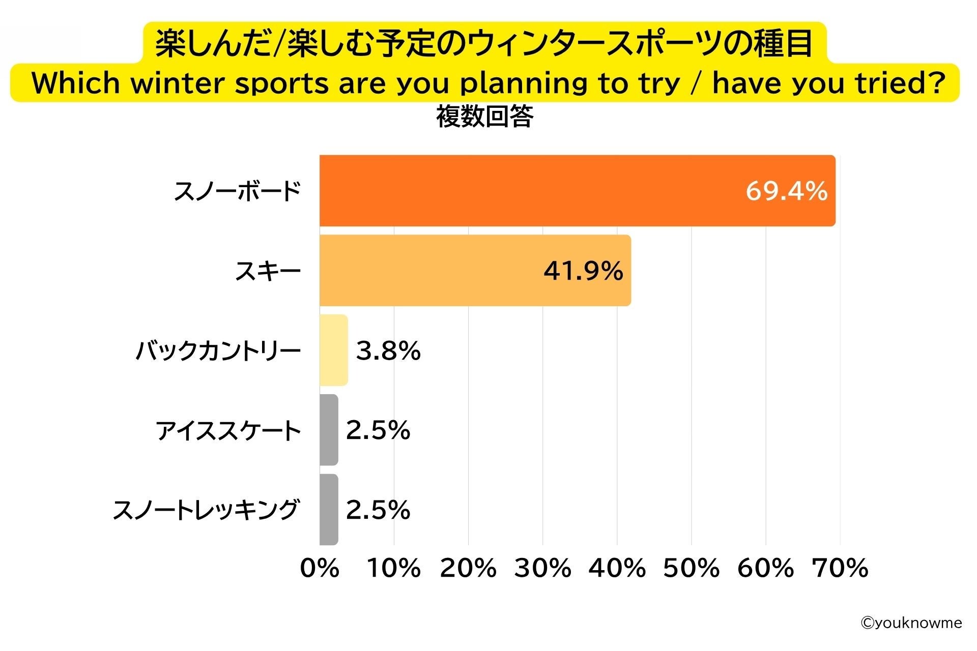 既に楽しんだ、もしくはこれから楽しむウィンタースポーツの種目を問う設問では、「スノーボード(69.4%)」が最も多く、次いで「スキー(41.9%)」という結果になりました。この他、少数ではあるものの、アイススケートやバックカントリー、スノートレッキングという回答もありました。
