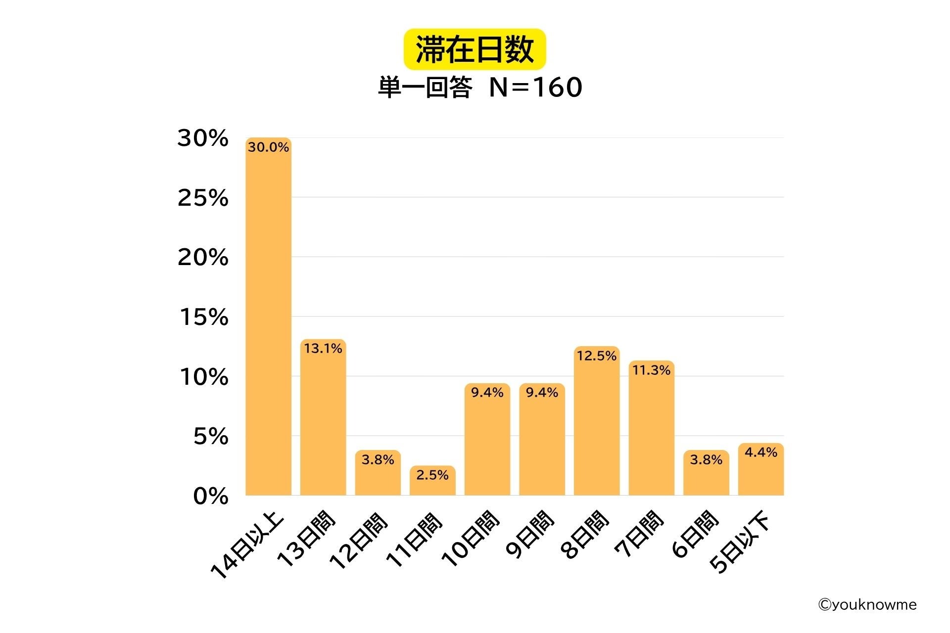 また、滞在日数を聞いてみると「14日以上」が30.0%と最も多く、7日以上の滞在の合計が全体の約9割と、全体的に長期滞在の傾向が強い結果となりました。