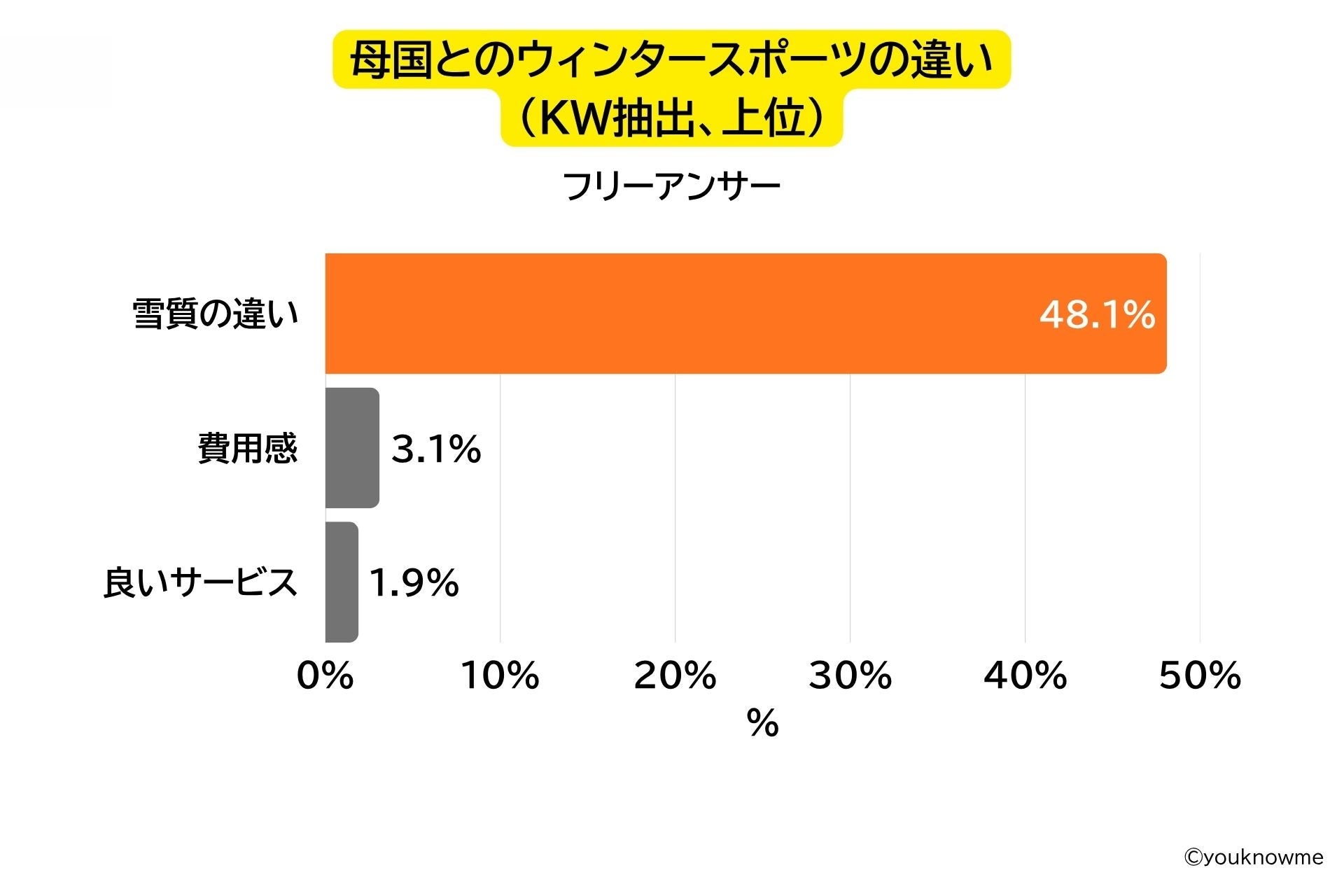 また、母国とのウィンタースポーツの違いを問う設問(フリーアンサー)においても、「Snow quality(香港、30代女性)」、「Great snow, food, friendly people.(アメリカ、30代女性)」と具体的に雪質に関するコメントが多数寄せられる結果となりました。