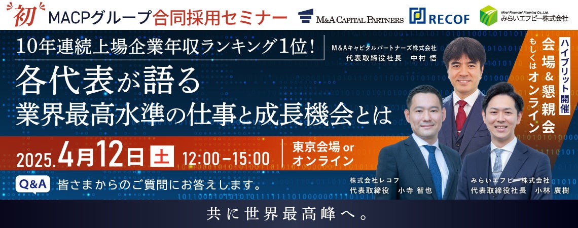 M&Aキャピタルパートナーズ株式会社(東京都中央区・代表取締役社長 中村 悟) は、今回、共に「世界最高峰の投資銀行」を創っていく仲間に向けた採用セミナーを開催いたします。MACPグループ代表の3名が、"業界最高水準の仕事と成長機会"について語ります。