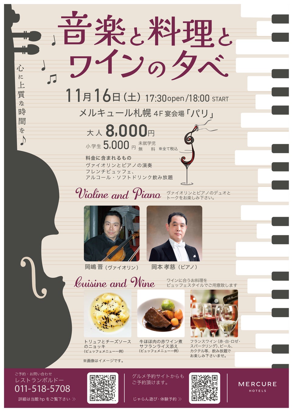 【メルキュール札幌】11/16(土)『⾳楽と料理とワインの⼣べ』を開催。上質な⾳楽とフレンチビュッフェ、そしてワインの三重奏をご堪能ください。
