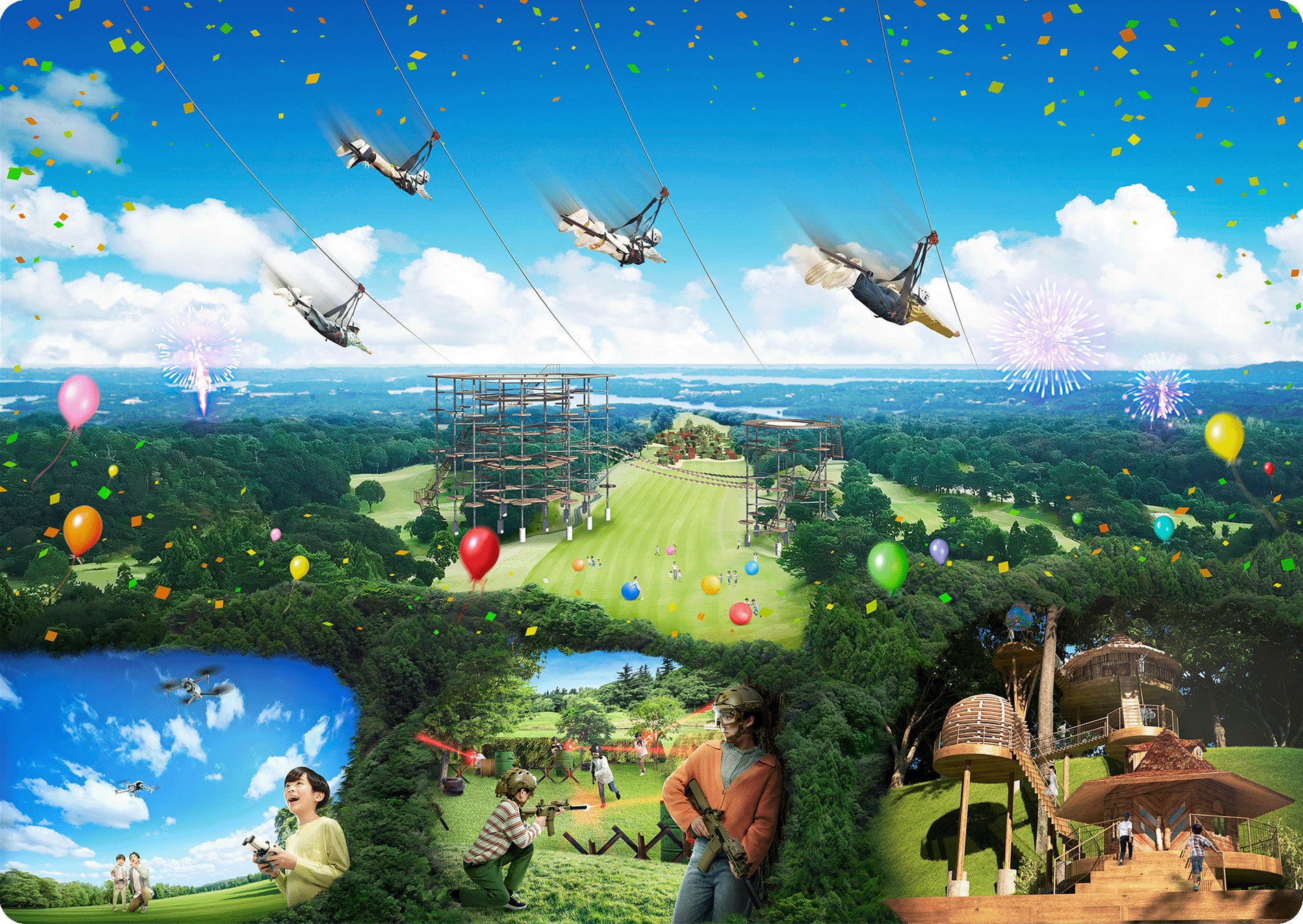 体験型アトラクションは、「ジップライン」「タワー型アスレチック」「サバイバルゲーム」などの本格的なアトラクションから、「パターゴルフ」や「芝滑り」などの芝生の上で気軽に遊べるアクティビティまで、全20種類のコンテンツを思う存分お楽しみいただけます。