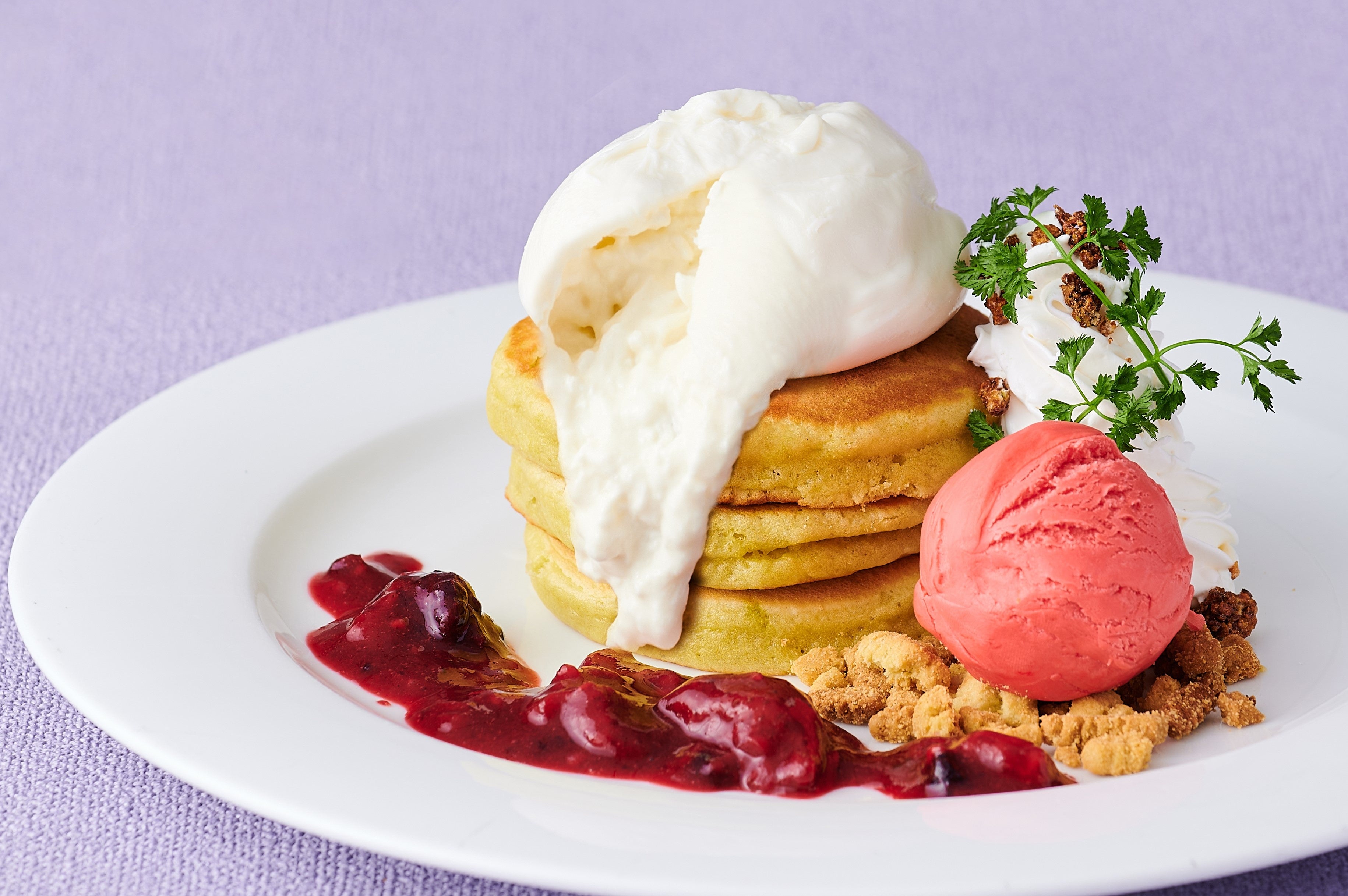 ブラータチーズを切ると、とろっと溢れ出すクリーミーなモッツァレラと生クリームが、香ばしいピスタチオ風味のパンケーキと甘酸っぱいベリーソースと絡み合い、多層に重なった味わいをお楽しみいただけます。