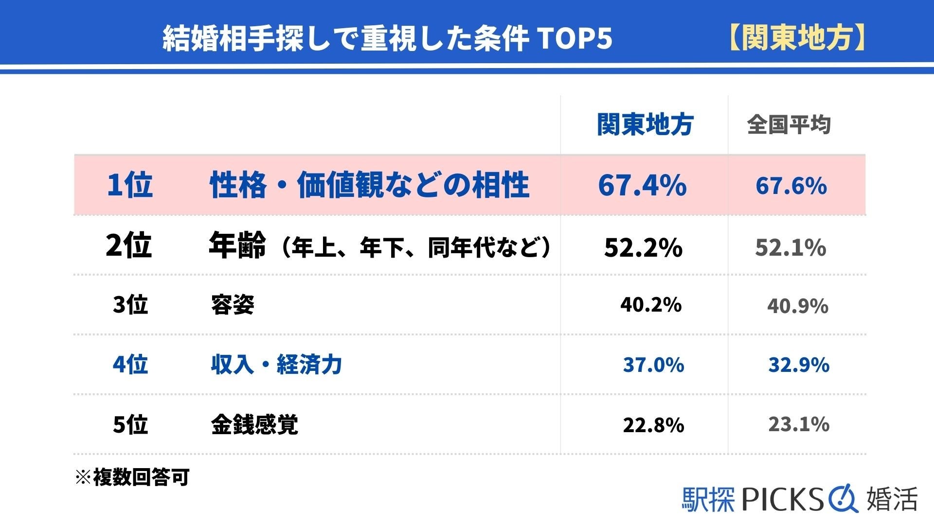 関東の人が「結婚相手探しの際、重視した条件」は、「性格・価値観などの相性」が1位で67.4%、次いで「年齢」が52.2%で2位となりました。「性格や価値観」については、全国的に見ても、重視する方が多い傾向にあります。
