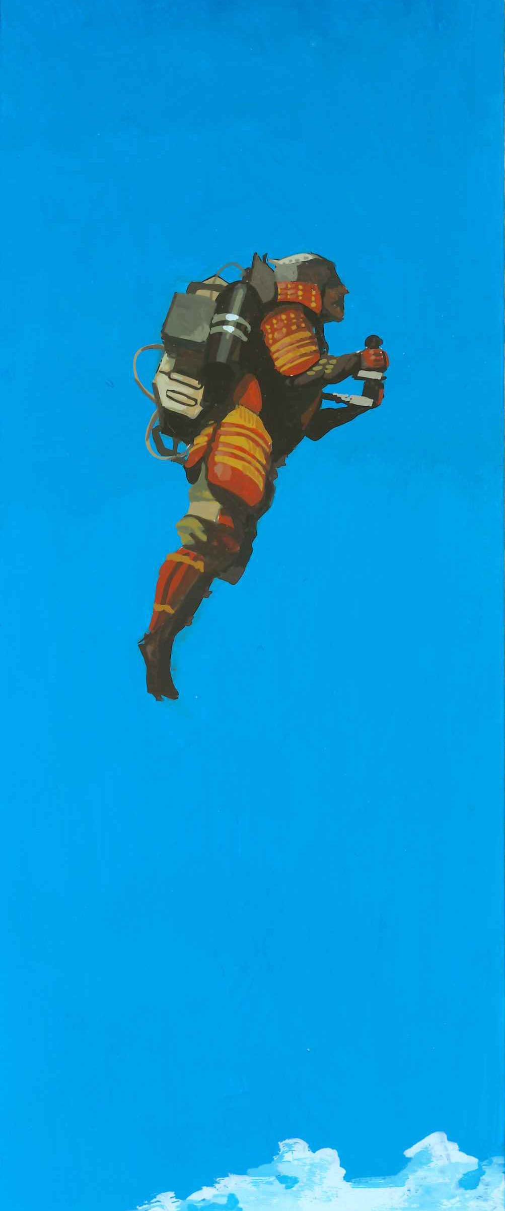 (左)「sky -jet pack 1」紙にアクリル彩色、(右)「Armored space」パネルにアクリル彩色
