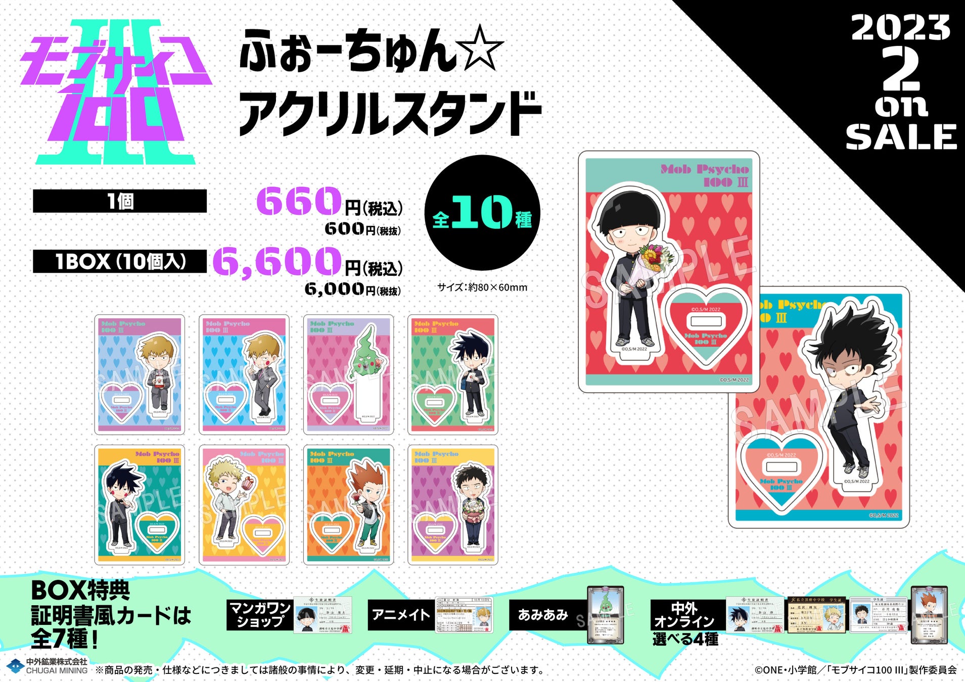 TVアニメ『モブサイコ100 Ⅲ』より、ミニキャラ描き起こしの「ふぉーちゅん☆アクリルスタンド」が登場!店舗別BOX特典で証明書風カードが付属!