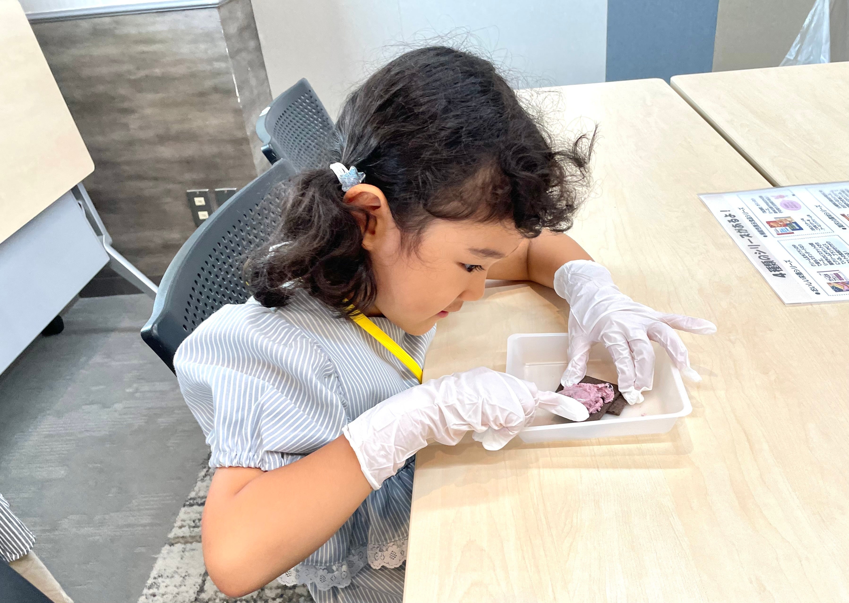 色々なお菓子を試食し、どんな材料が入っているか食べて、香って当ててみるクイズに挑戦。するどい味覚でずばり正解のお子さんもいて社員も驚いていました。