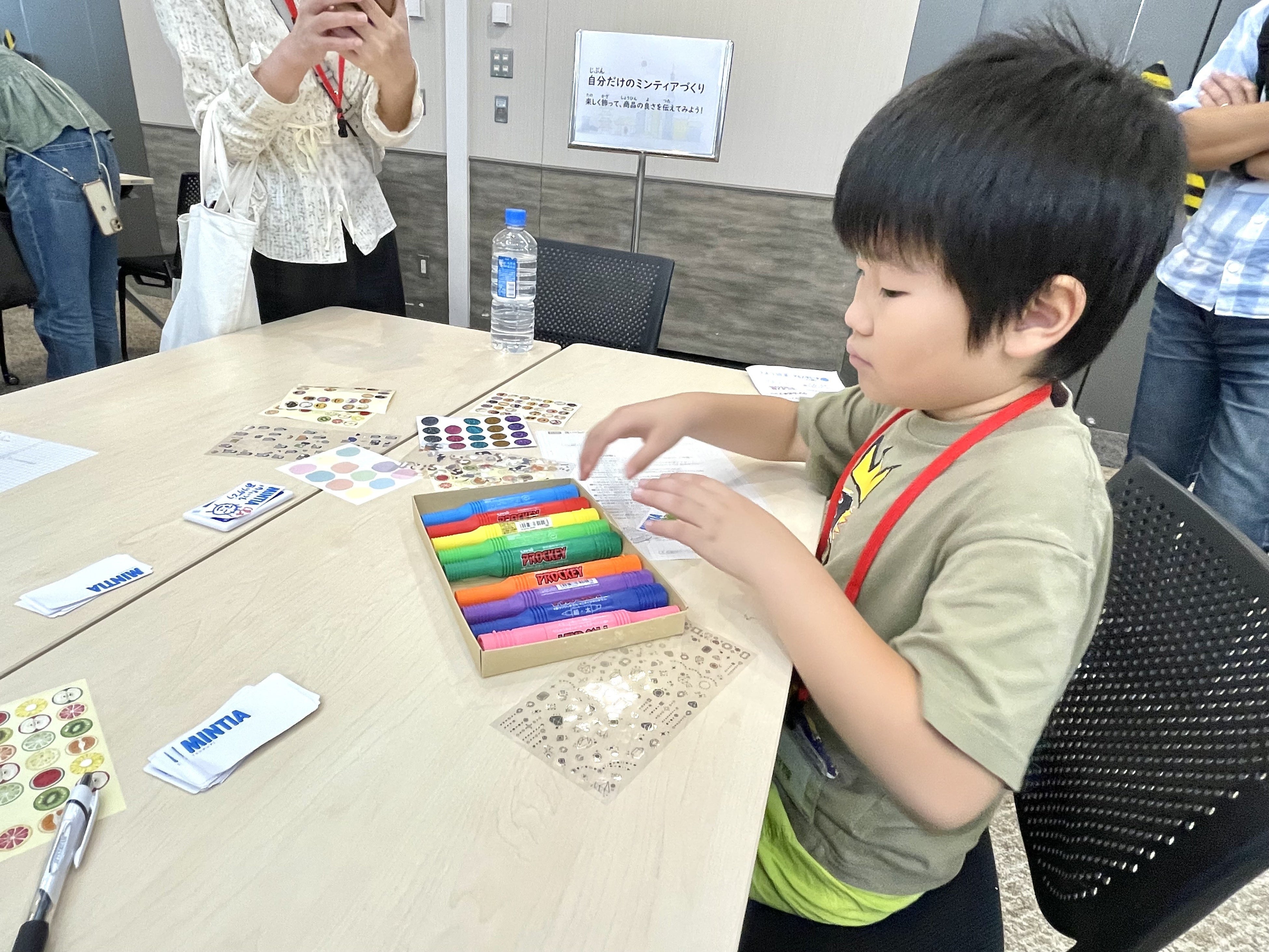 カラーペンやシールでデコレーションした個性的なラベルは「ミンティア」に貼ってできあがり!「お父さんやお母さんにプレゼントする!」というお子さんもいました。