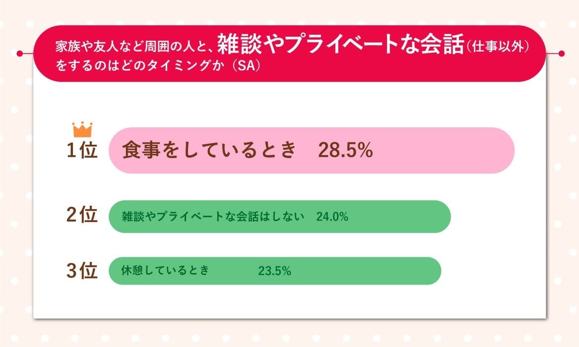 雑談やプライベートな会話をするシーン1位は食事時、2位は会話をしない、3位は休憩時
