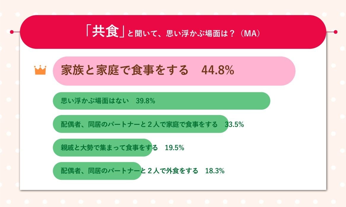 「共食」と聞いて、思い浮かぶ場面を調査したところ、1位は「家族と家庭で食事する(44.8%)」、2位は「思い浮かぶ場面はない(39.8%)」3位は「配偶者、同居のパートナーと2人で家庭で食事をする(33.5%)」という結果になりました。この結果から、「共食」という言葉はまだあまり知られていないものの、「家族や同居しているパートナーとの家での食事」が「共食」であると多くの人に捉えられていることがわかりました。