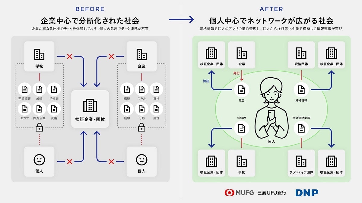DNPと三菱UFJ銀行は、個人の属性・学歴・資格・職歴などのアイデンティティを自ら管理し証明できる社会や、企業がデジタル技術を活用し高度な人的資本経営を可能とする社会の実現を展望し、本基本合意書に基づき、自己主権型のデジタル証明書(Verifiable Credentials:VC)※1の発行や分散型識別子(Decentralized Identifiers:DID)※2に係る技術検証、これらを活用するビジネスの事業化検証を進めていきます。