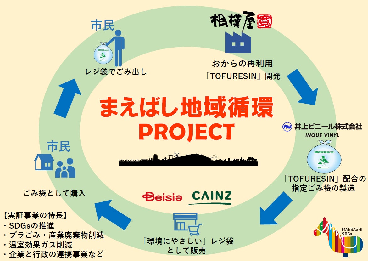 今回の実証事業で販売を行うレジ袋は、前橋市に拠点を置く相模屋食料株式会社(本社:群馬県前橋市、代表取締役社長:鳥越淳司、以下、相模屋食料)が、豆腐の製造過程で発生する「おから」から開発した、プラスチック原料の「TOFURESIN」を配合し、井上ビニール株式会社(本社:前橋市、代表取締役社長:井上一彦、以下、井上ビニール)と共同作製した全国初となる市指定のごみ袋です。1枚あたり、生おからを1.2g使用したバイオマス素材の袋で、特許も取得しています。