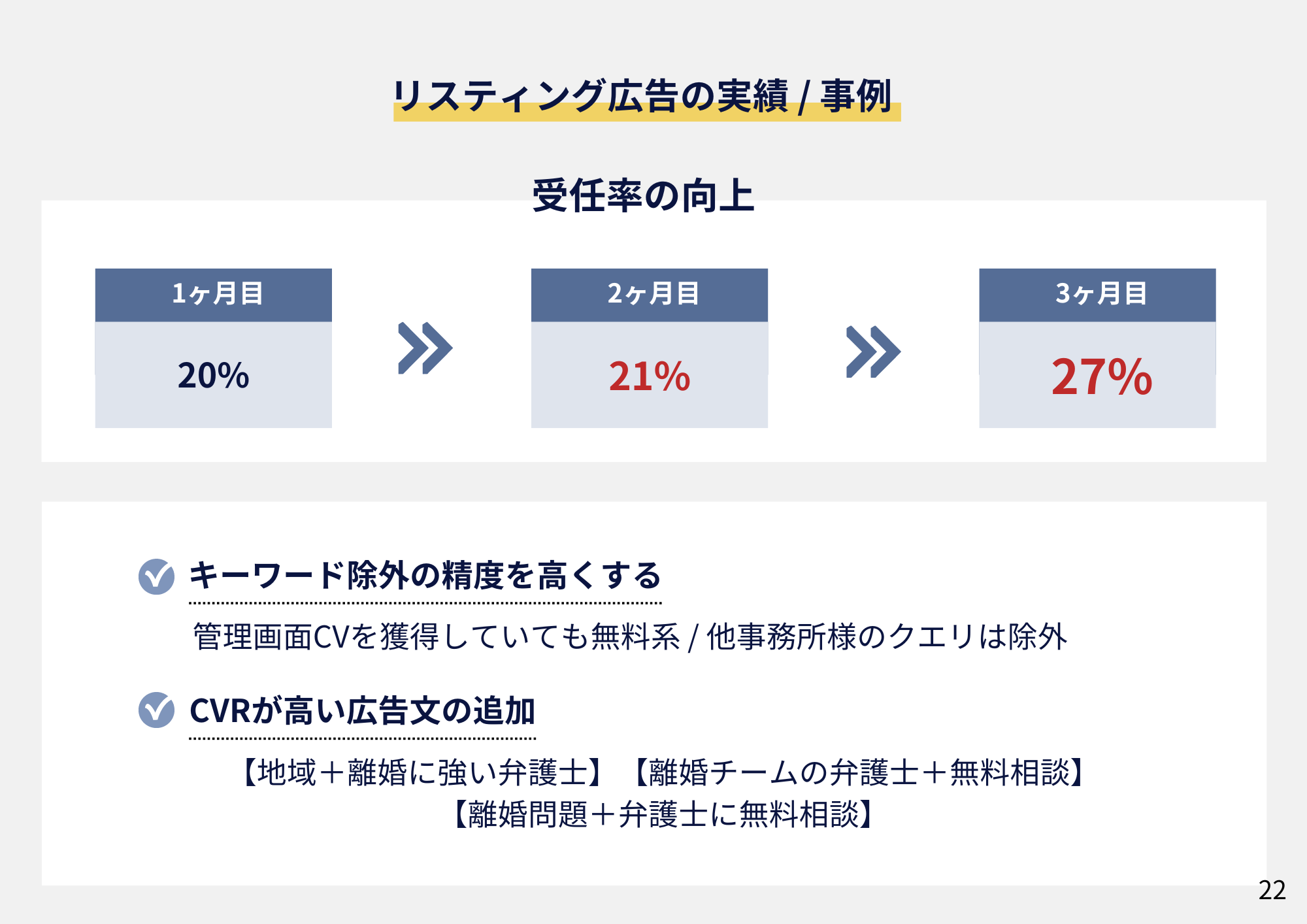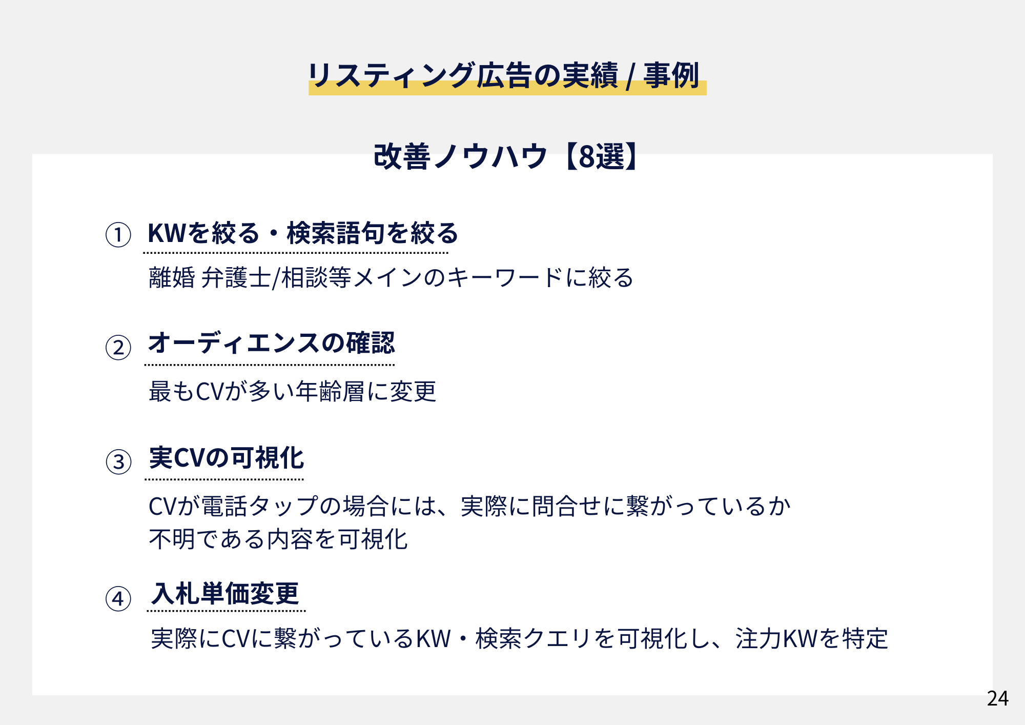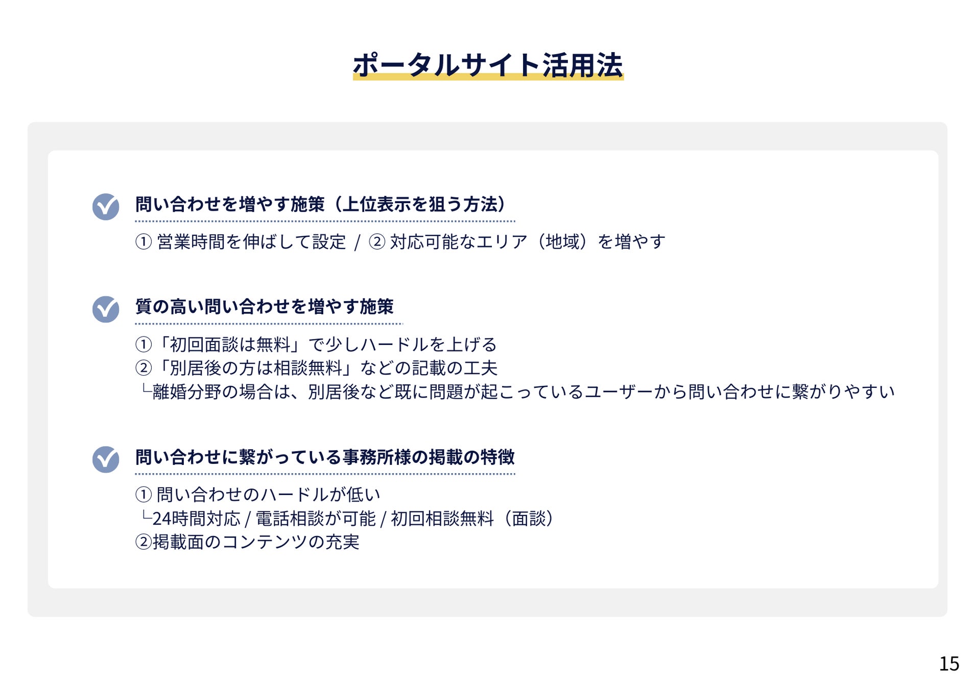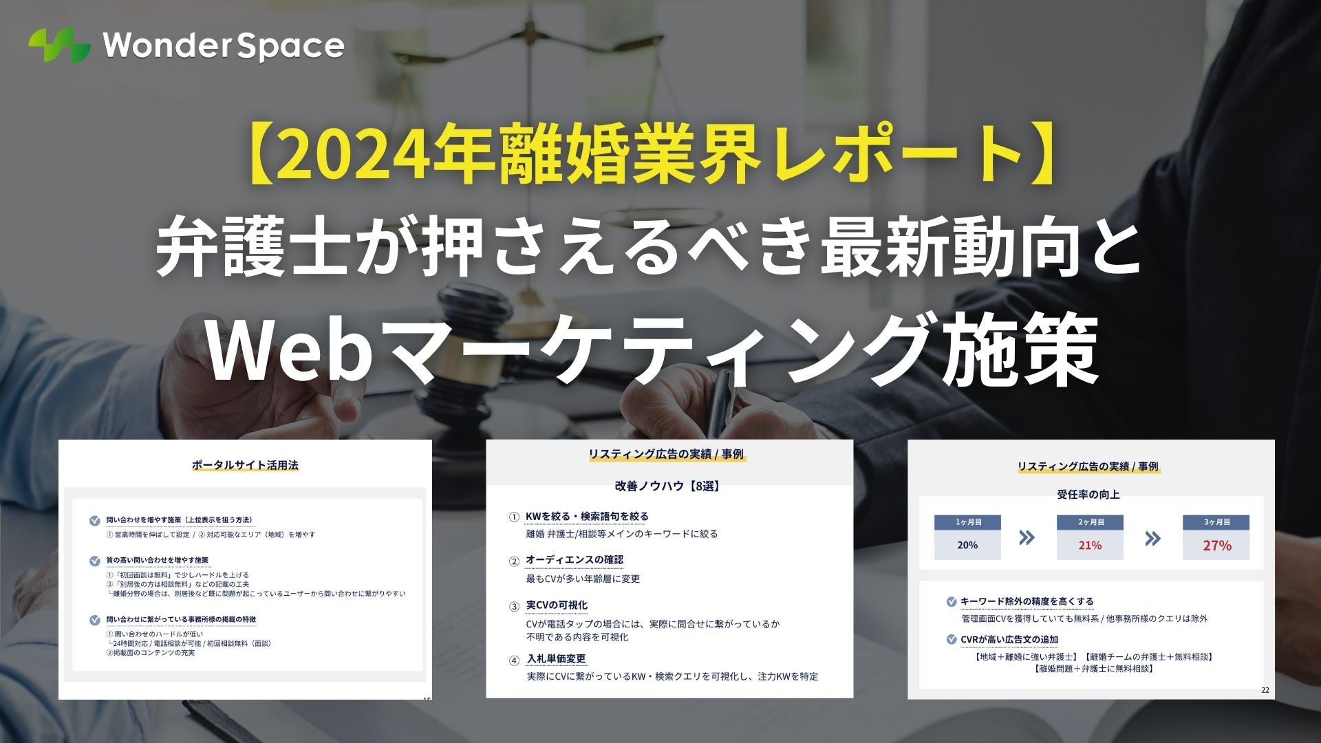 【資料内容】 大手法律事務所をはじめ、数多くの士業事務所様のマーケティング支援を行っている中で得た知見をもとに『【2024年離婚業界レポート】弁護士が押さえるべき最新動向とWebマーケティング施策』を公開いたしました! 本レポートをお読みいただくことで、離婚分野の市場動向を把握できるだけでなく、月間広告運用額が2億円を超える弊社ならではのWebマーケティング施策のノウハウを活用し、効果的な集客戦略を立てることができます。ぜひ、ご活用ください! |