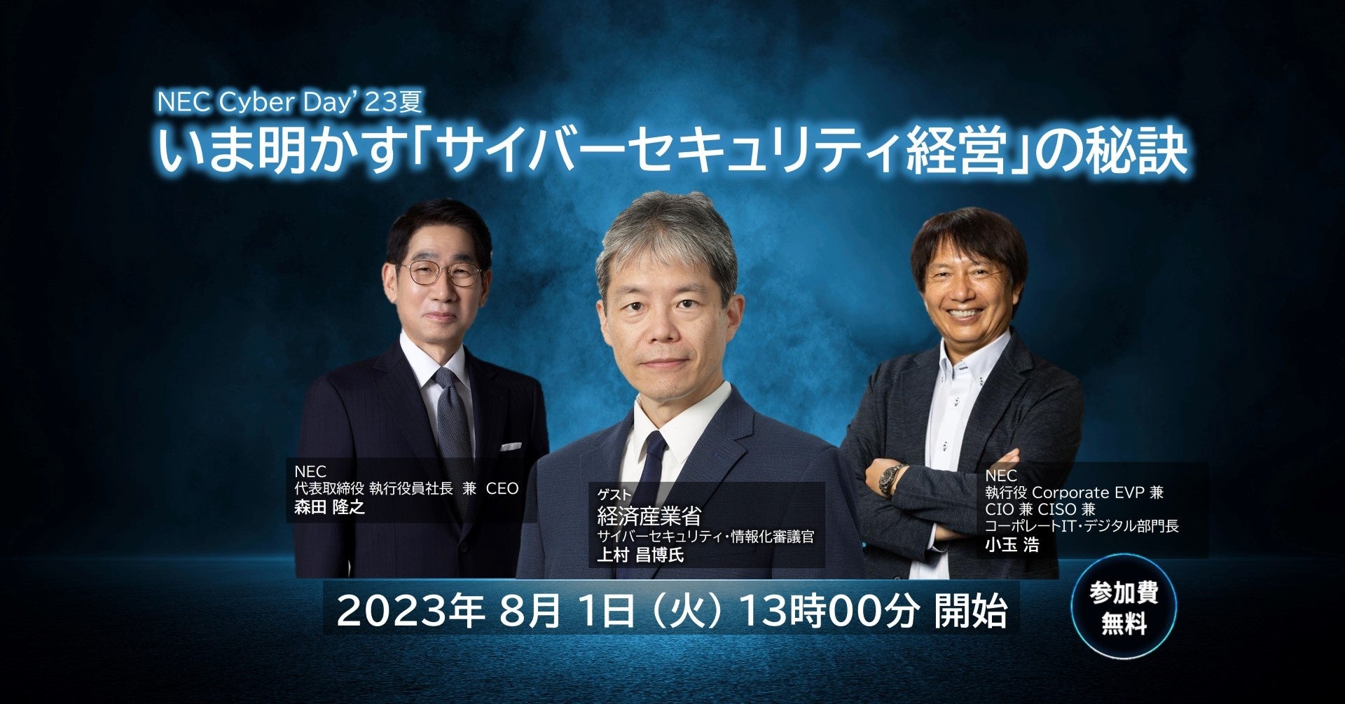 今回は、経済産業省で、産業界のセキュリティ対策やDX人材育成の支援を担当されている上村審議官をお招きし、「サイバーセキュリティ経営」の実現のために企業の経営層に求めることをお話頂きます。それを受けて、NECの経営層がどのように実践しているか、加えて、NECのセキュリティ対策部門である「CISO統括オフィス」の実務担当者から、現場でのリアルな実践例を対談形式でお伝えします。