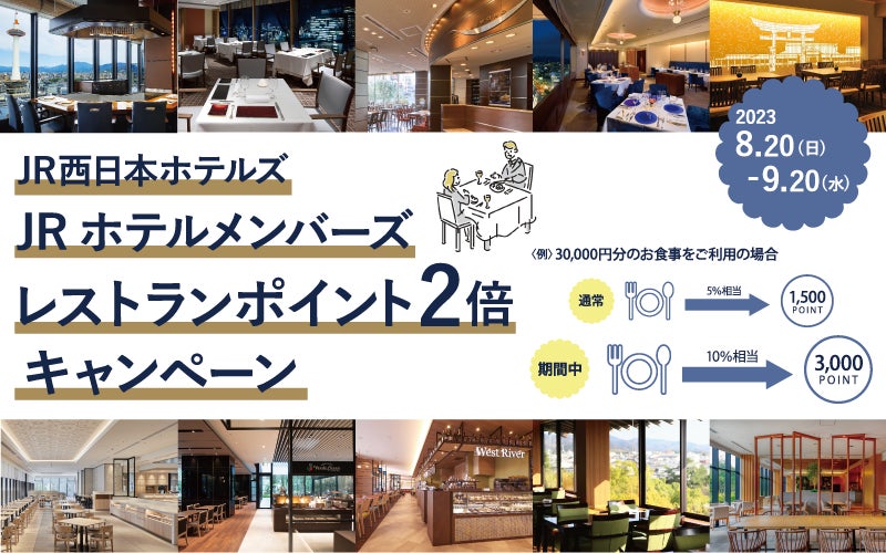 通常、レストランご利用料金の5%相当(100円【税抜、サービス料込】につき5ポイント)のJRホテルメンバーズポイントを付与しているところ、期間中は10%相当(100円【税抜、サービス料込】につき10ポイント)のポイントを付与。
