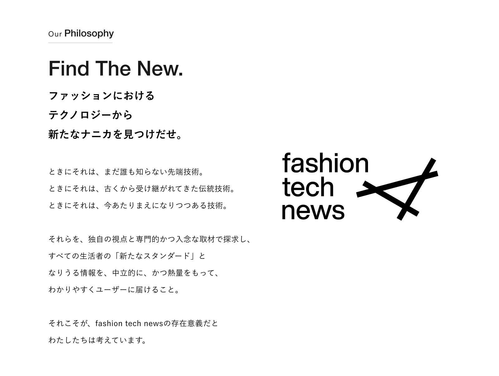 2018年の運用開始以来、ファッションの先端技術やブランドの歴史、ファッションがカルチャーに及ぼした影響など、様々なファッションとテクノロジーのニュースを発信し続け、現在では約1,700本の記事を公開しています。また、2024年3月に日本の工芸を未来へ繋ぐ新プロジェクト「Artisan(アルチザン)」を開始し、同年5月には8つ目のカテゴリとなる「BEAUTY」を新設するなど、コンテンツの領域を拡大し続けています。さらに、同年8月には「マイページ」、2025年2月には「音声読み上げ機能」を導入するなど、読者の皆さまに快適に記事をお読みいただけるよう、継続的な機能の追加や改善を行っています。こうした取り組みの中で、今後の更なる成長に向けてfashion tech newsのフィロソフィーを再定義し、新たなステージへと挑戦するためにロゴのリニューアルを行いました。