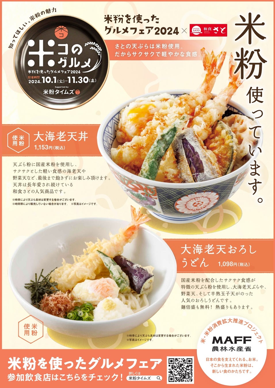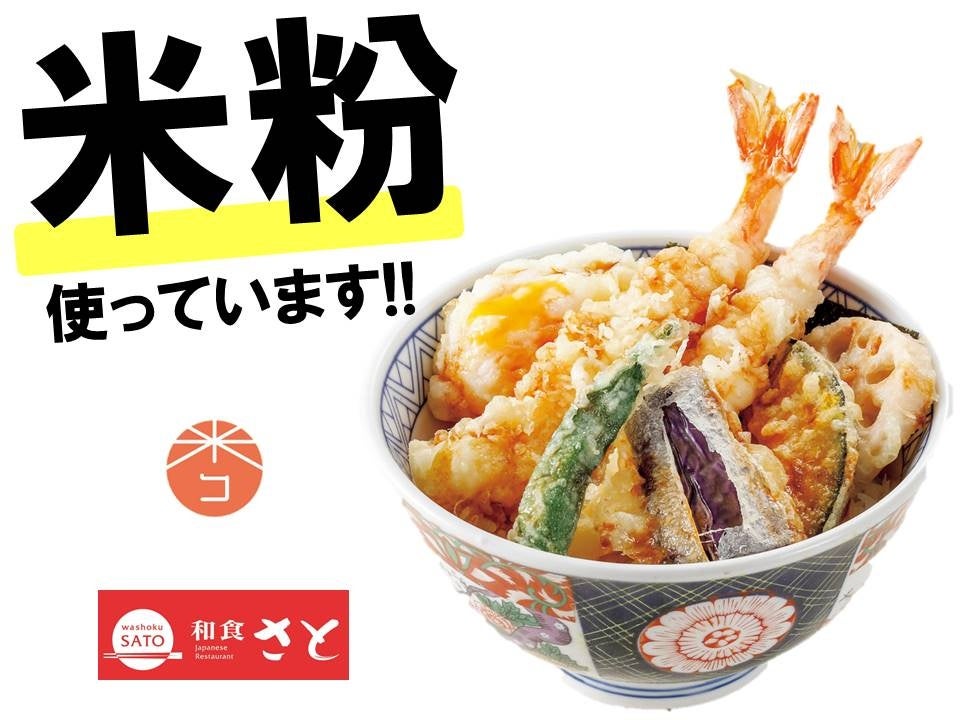 和食さとは「米粉」入り天ぷら粉を使用した商品として、「大海老天丼」や「大海老天おろしうどん」などの人気の天ぷらメニューを全店で販売しており、米粉の消費拡大の推進に賛同し今回参加します。