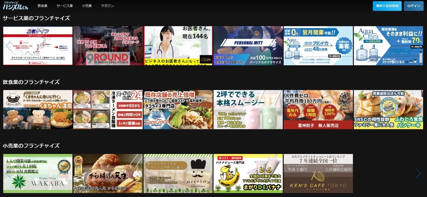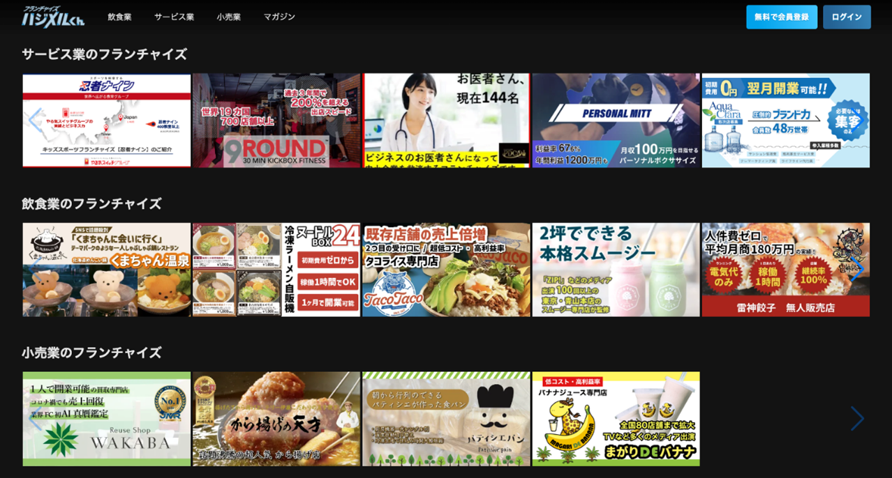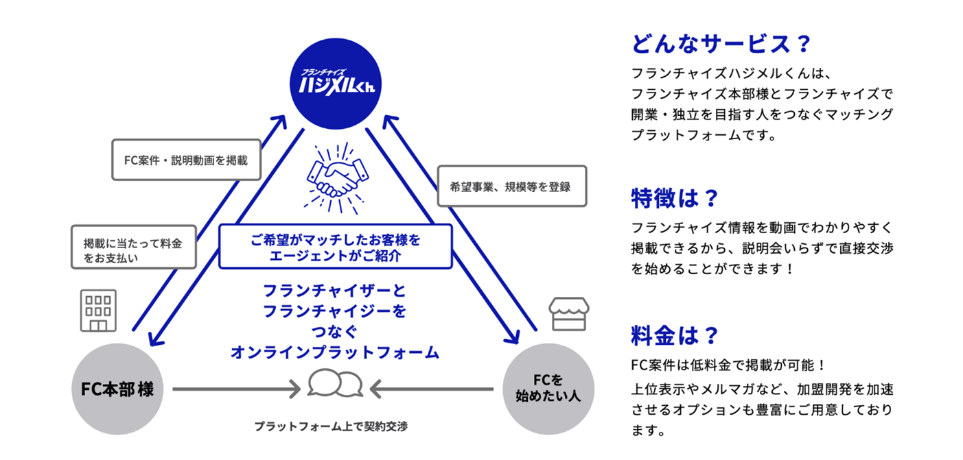 フランチャイズハジメルくんとは、事業拡大を目指すフランチャイザーが動画でフランチャイジーに発信、契約交渉まで進めることができるマッチングプラットフォームです。また、直営店しか存在しない事業者がフランチャイズ等を活⽤し店舗拡⼤をしていくためのフランチャイズ本部機能の構築、加盟店開発までサポートしています。