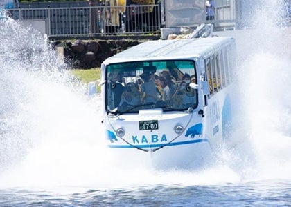 「TOKYO NO KABA」は、お台場を象徴する自由の女神とレインボーブリッジ越しに都心を望む絶好のロケーションにある大型複合ショッピングセンター「アクアシティお台場」が出発地です。周辺の商業施設群を颯爽と走り抜け、陸上走行した後、お台場海浜公園のスローブから大きな水しぶきとともに海へ一気に飛び込む大人も子供も大興奮なスプラッシュ体験がお愉しみいただけます。また、マリンボーダーの制服を着たアテンダントによる活気ある楽しい観光案内と、臨場感溢れる高音質3Dサウンドが約45分間のお台場周遊コースのワクワク感をより一層盛り立てます。