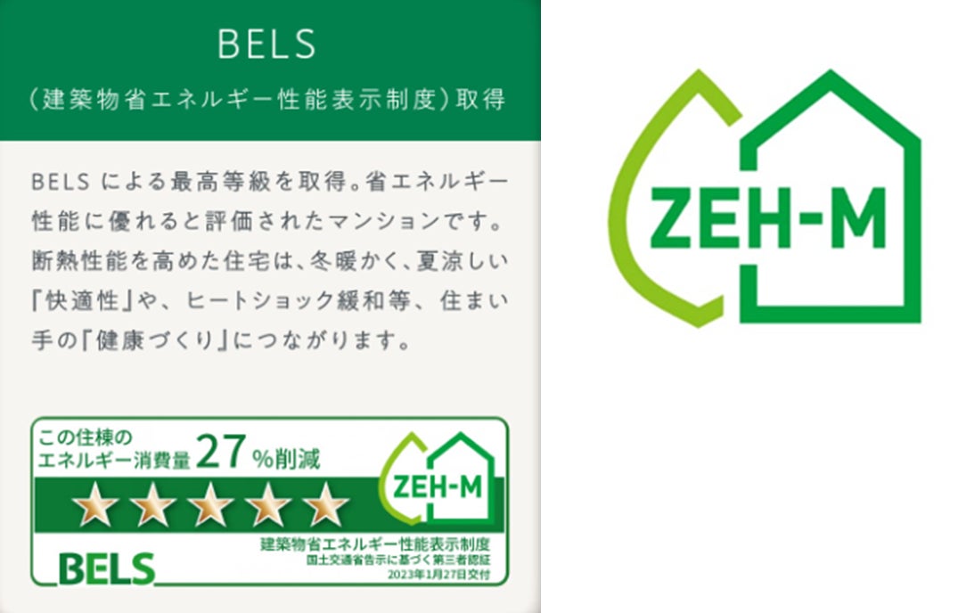 敷地の約51%の豊かな緑量を誇る公開空地として、武家屋敷の屋敷林をモチーフに整備をしています。その他にもLOW-Eペアガラスの採用やエネルギー効率の高い床暖房を複数室に設けるなど環境負荷を軽減する計画としており、BELS5スター、ZEH‐M Orientedなどの外部評価機関の評価も多数取得しています。また、これらの取り組みが評価され、一般社団法人環境共創イニシアチブの令和4年度超高層ZEH-M(ゼッチ・マンション)実証事業並びに一般財団法人民間都市開発推進機構の共同型都市再構築業務に採択されています。