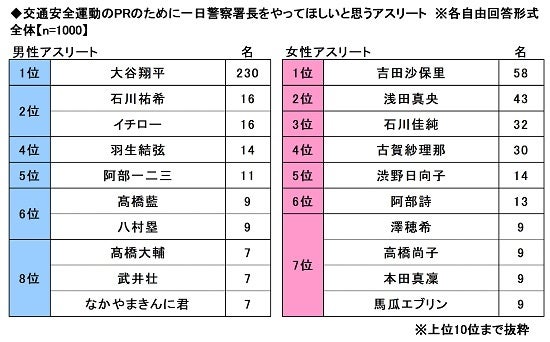 交通安全運動のPRのために一日警察署長をやってほしいと思うアスリート(引退した人を含む)を聞いたところ、男性アスリートでは、「大谷翔平さん」(230名)がダントツとなり、2位「石川祐希さん」「イチローさん」(いずれも16名)、4位「羽生結弦さん」(14名)、5位「阿部一二三さん」(11名)となりました。他方、女性アスリートでは、1位「吉田沙保里さん」(58名)、2位「浅田真央さん」(43名)、3位「石川佳純さん」(32名)、4位「古賀紗理那さん」(30名)、5位「渋野日向子さん」(14名)となりました。