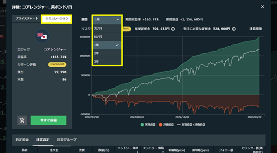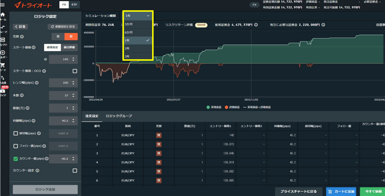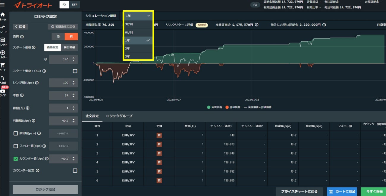 トライオートFX/ETFにおいて、現時点(シミュレーション機能を使用した当日)から過去の指定の期間までの通貨ペアの値動き等のデータを基に、もしも、その地点から自動売買を動かしていたら、どの位の損益が発生したのかをグラフと共に算出を行う機能となります。