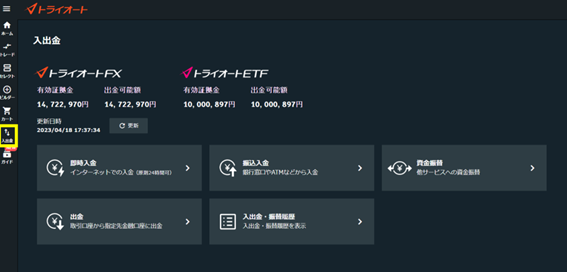 取引画面より、「入出金」のタブを押すと、下記画面が表示されます。