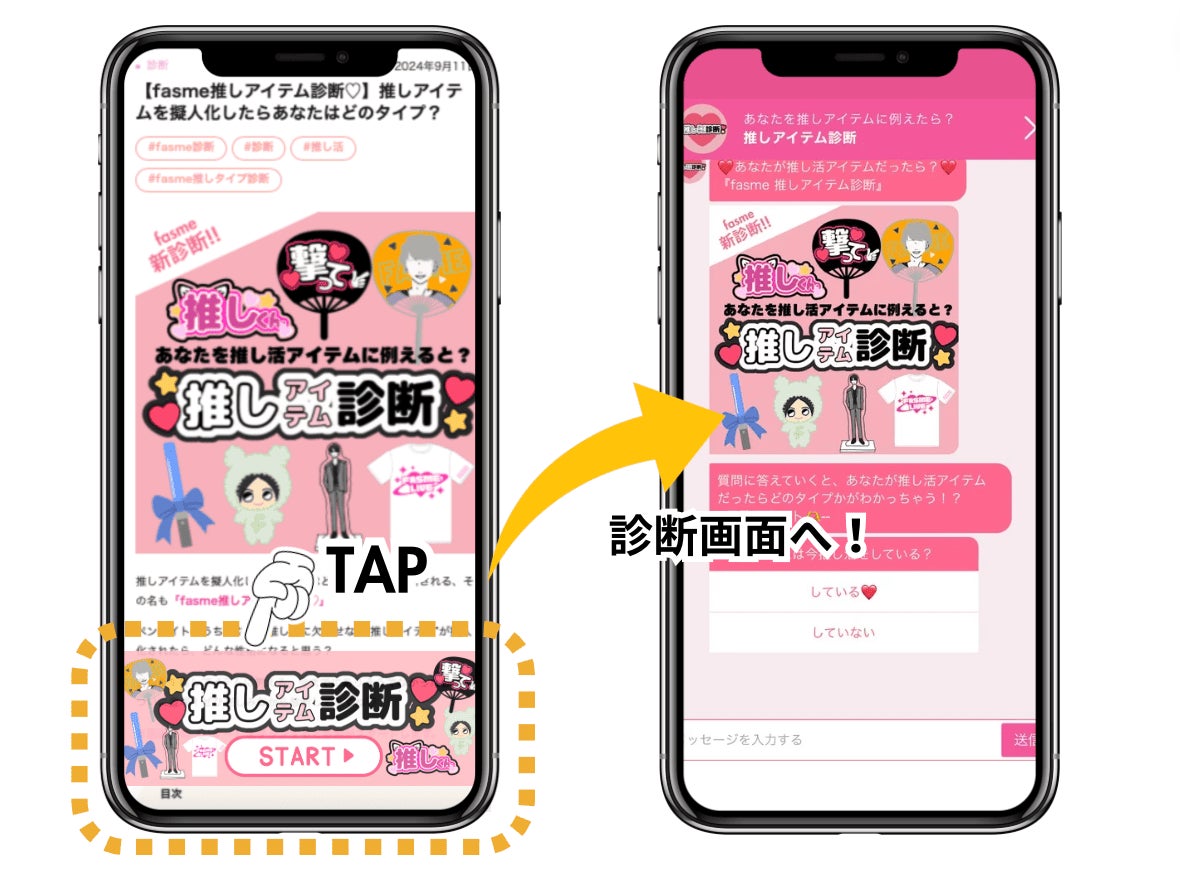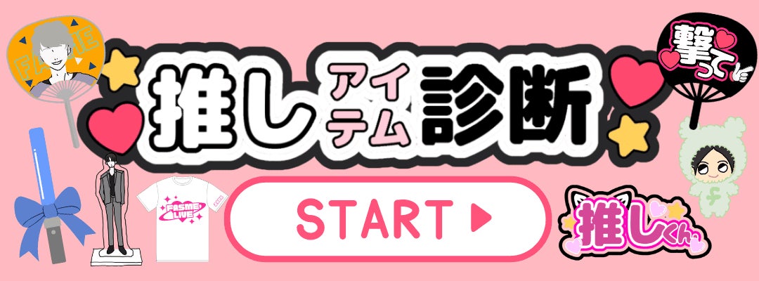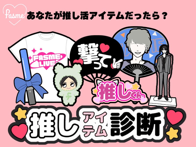 「fasme推しアイテム診断♡」は、推しを応援する活動(推し活)に欠かせないアイテムを擬人化することで、あなたの性格やタイプを診断するコンテンツです。