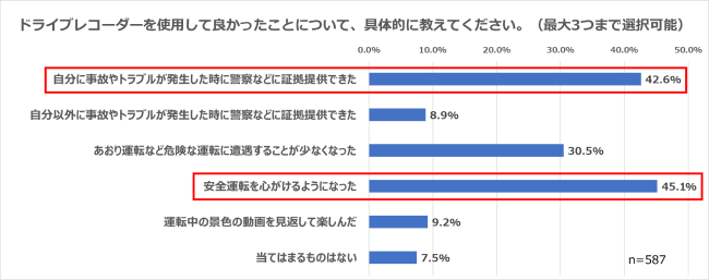 さらに、ドライブレコーダーを使用して「良かったことがあった」と回答した人(587人)に、具体的な内容を尋ねました。