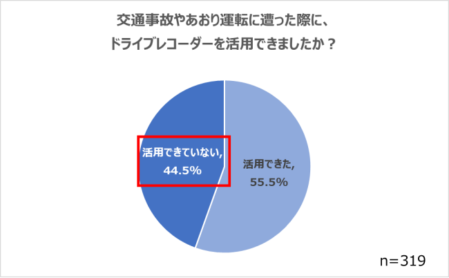 ・「交通事故やあおり運転に遭ったことがある」と回答した319人のうち、交通事故やおあり運転に遭った際にドライブレコーダーを活用できなかった人は44.5%。