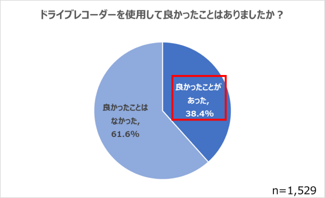ドライブレコーダーを「使用している」と回答した1,529人に対して、「ドライブレコーダーを使用して良かったことはありましたか?」と質問したところ、「良かったことがあった」と回答した人は38.4%、「良かったことはなかった」と回答した人は61.6%と、「良かったことがあった」と回答した人のほうが少ない結果となりました。