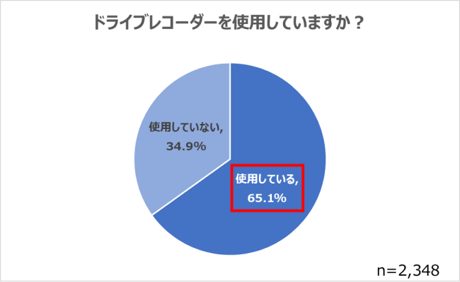 ・アンケート回答者2,348人に「ドライブレコーダーを使用していますか?」と質問したところ、使用している人が65.1%、使用していない人は34.9%と、半数以上がドライブレコーダーを使用しているという結果に。