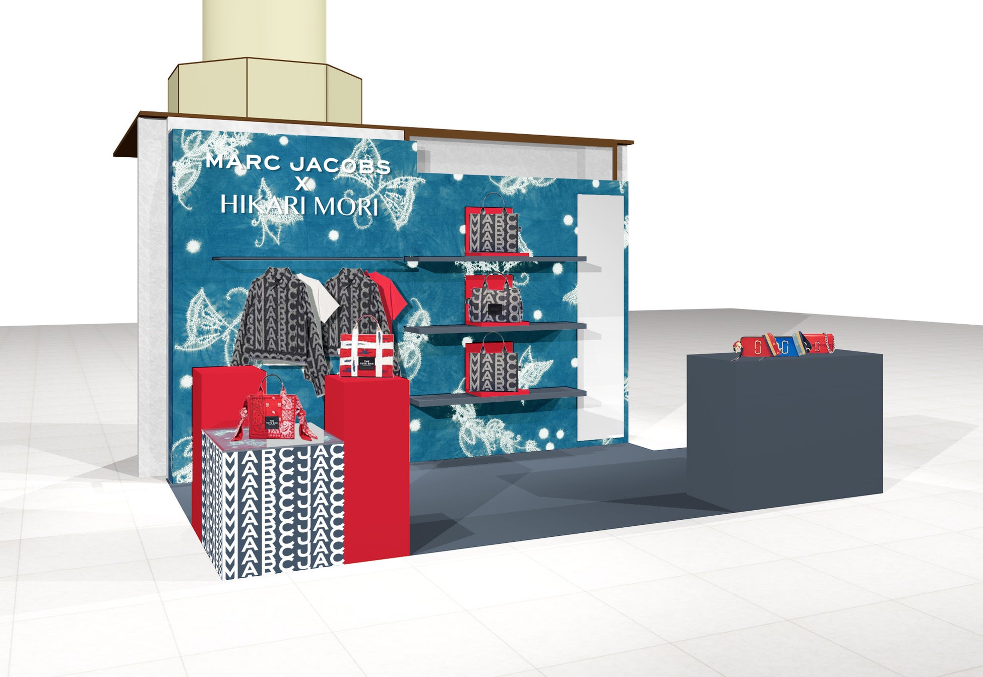 会場では、この夏登場したデニム素材のTHE MONOGRAM COLLECTIONをはじめ、バッグコレクションも最新作「THE J MARC SHOULDER BAG」から、不動の人気を誇るアイコンバッグ「THE TOTE BAG」「THE SNAPSHOT」まで豊富に展開する。また、同日発売となる、MARC JACOBS x HIKARI MORI コラボレーションのバンダナは注目アイテム。