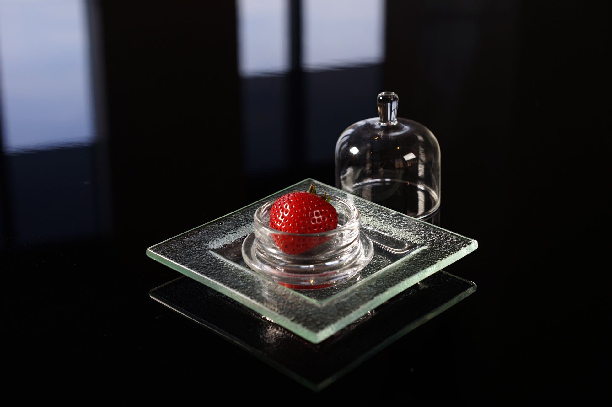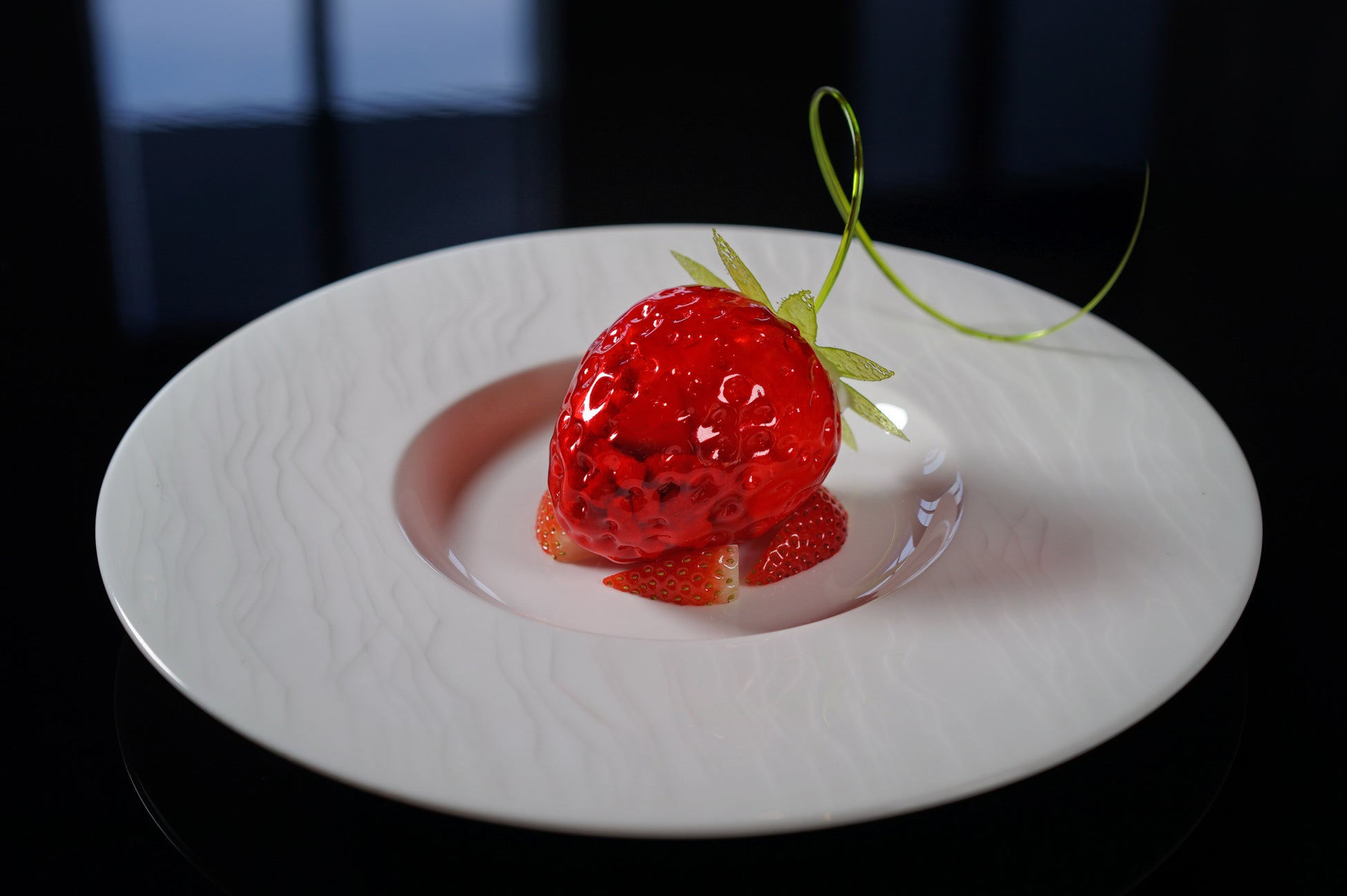 透けるほど薄い飴細工でできた、いちごの中にはパティシエが農場を視察して選び抜いた茨城県鉾田市の農園のフレッシュないちご、フランス産ロレーヌ岩塩使用の塩ミルクアイス、クランブル、バニラビーンズをたっぷり使用したミルクのエスプーマを入れ、そっとスプーンで割ってお召し上がりいただきます。ライムがほんのり香る北海道産のクリームを追い掛けした変化もお楽しみください。