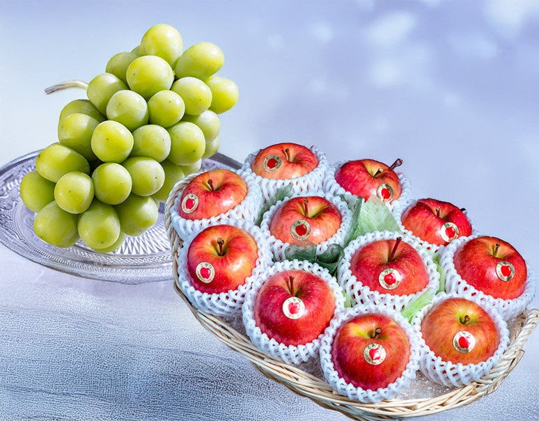 うまいもんドットコム一押しの究極の蜜入りりんご「こみつ」を詰めたバスケットの上に、大房のシャインマスカットが1房。