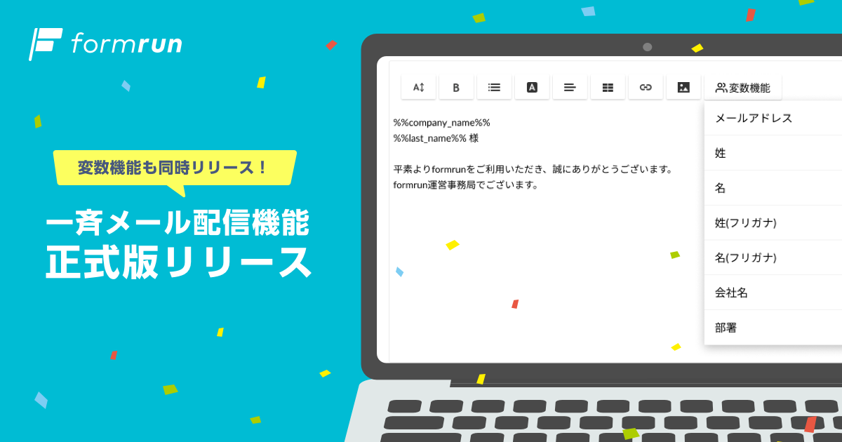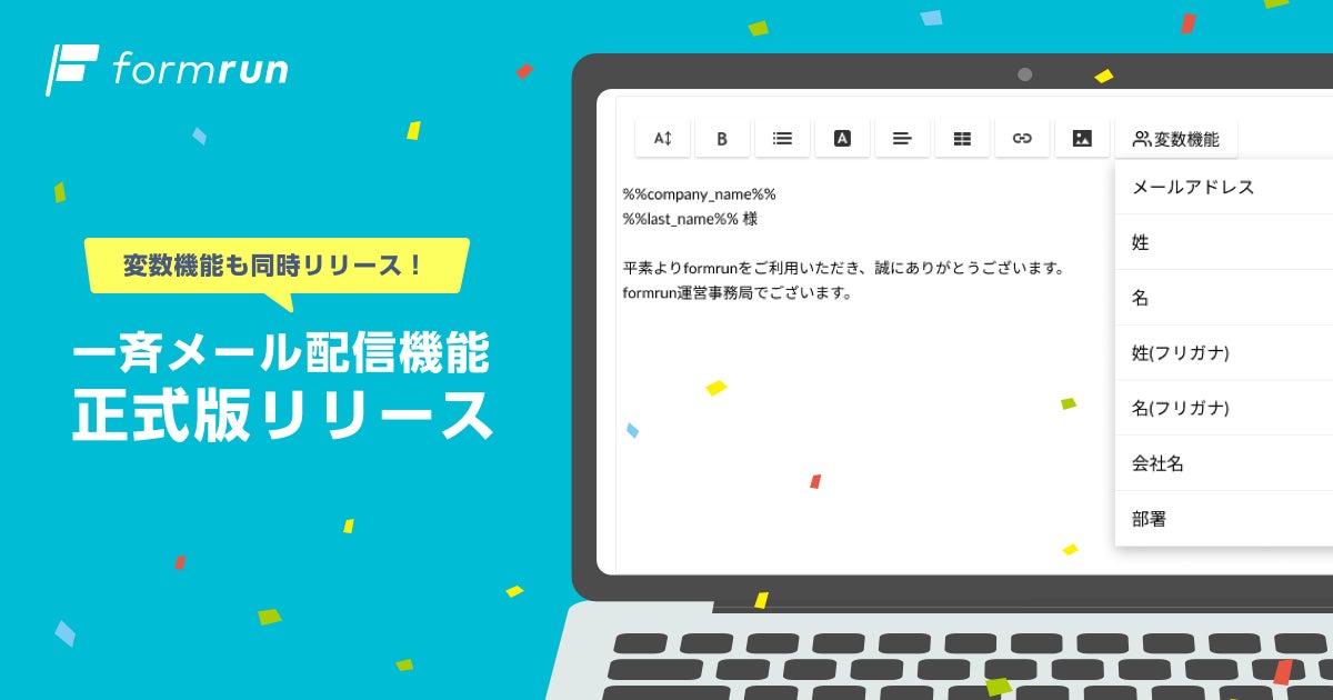 フォーム作成管理ツール『formrun』フォームで取得した顧客情報を細かいセグメントに分けメールを送付できる「一斉メール配信機能」を正式リリース!