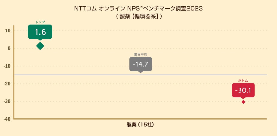 製薬企業15社のうち、NPSのトップは1.6ポイントとなりました。トップ企業とボトム企業の差は31.7ポイント、15社のNPS平均は-14.7ポイントとなりました。