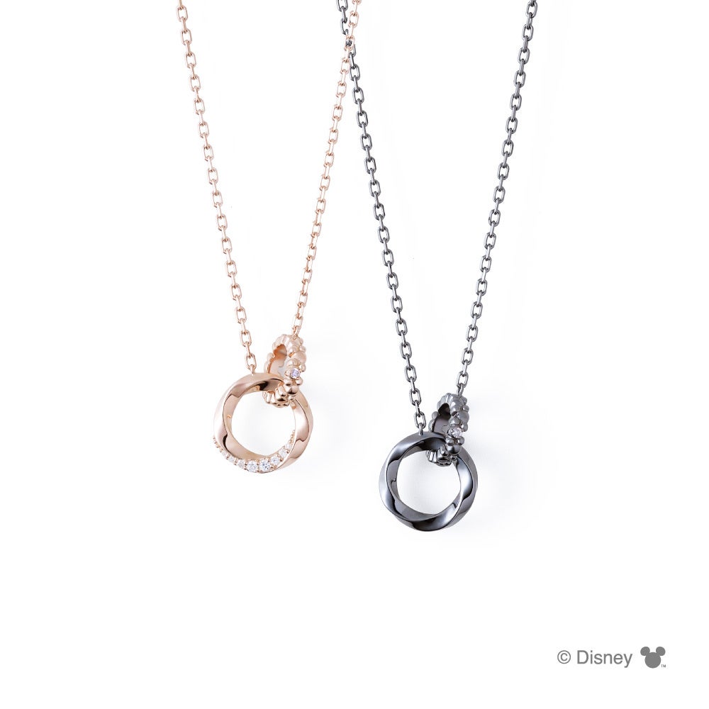 小さなミッキーアイコンが連なる、遊び心あふれたダブルリングのペアネックレス。