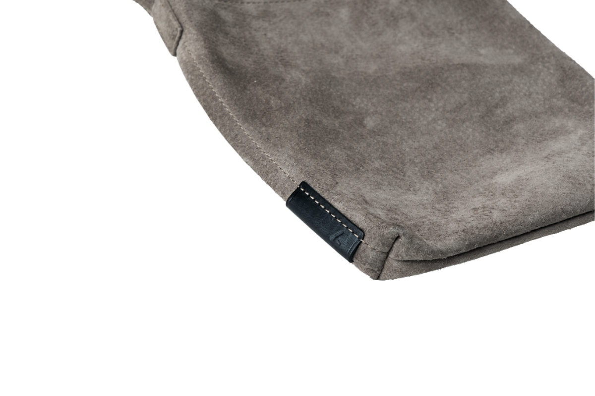 柔らかなピッグスエードにヌメ革製のタグがアクセント