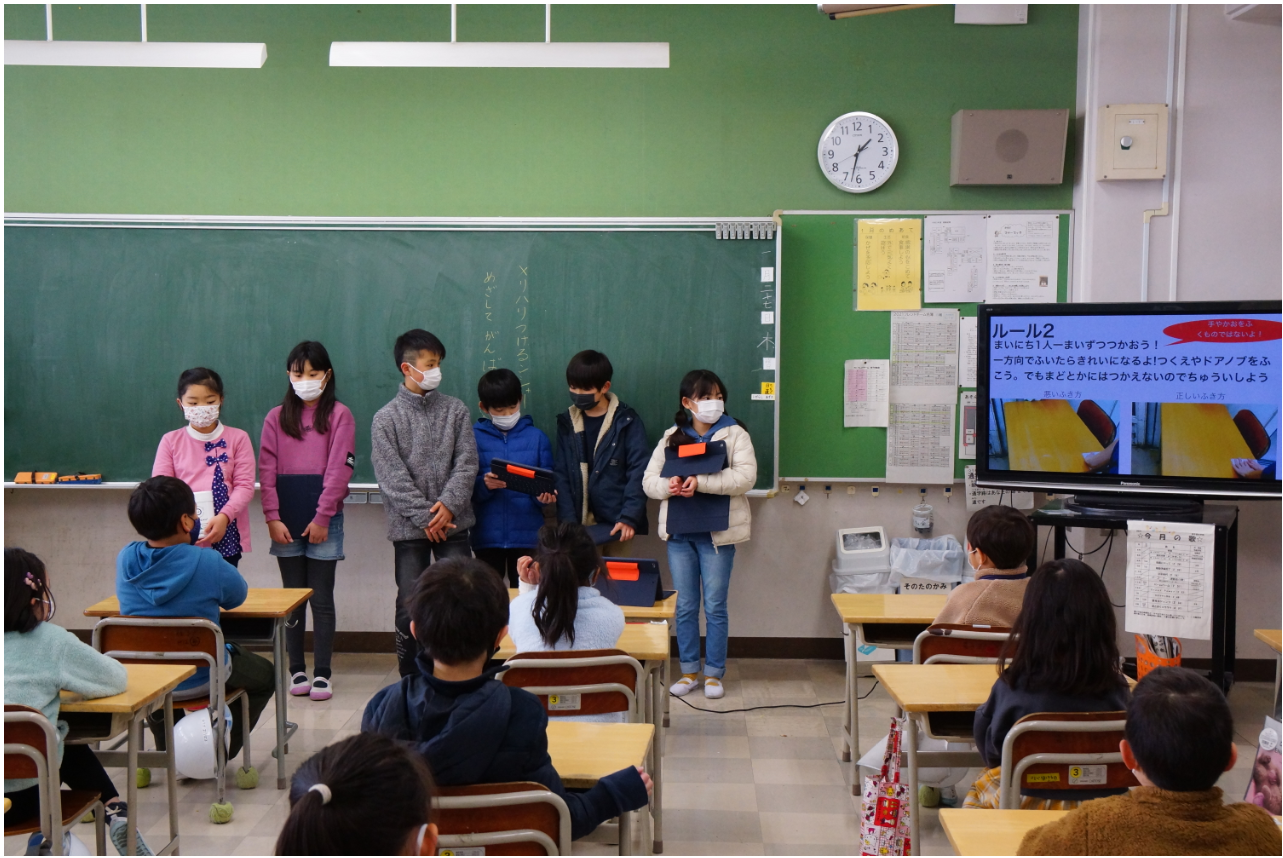 3月23日(水)には集大成として、「福育(拭く育)」発表会を開催し、学んだ感染対策や活動の成果を児童が保護者に対して発表しました。コロナ禍での衛生対策について自ら考え、学んだことを保護者に発信することで、家庭や地域へと広めていくことが狙いです。これまでの活動をまとめた発表内容をレポートします。