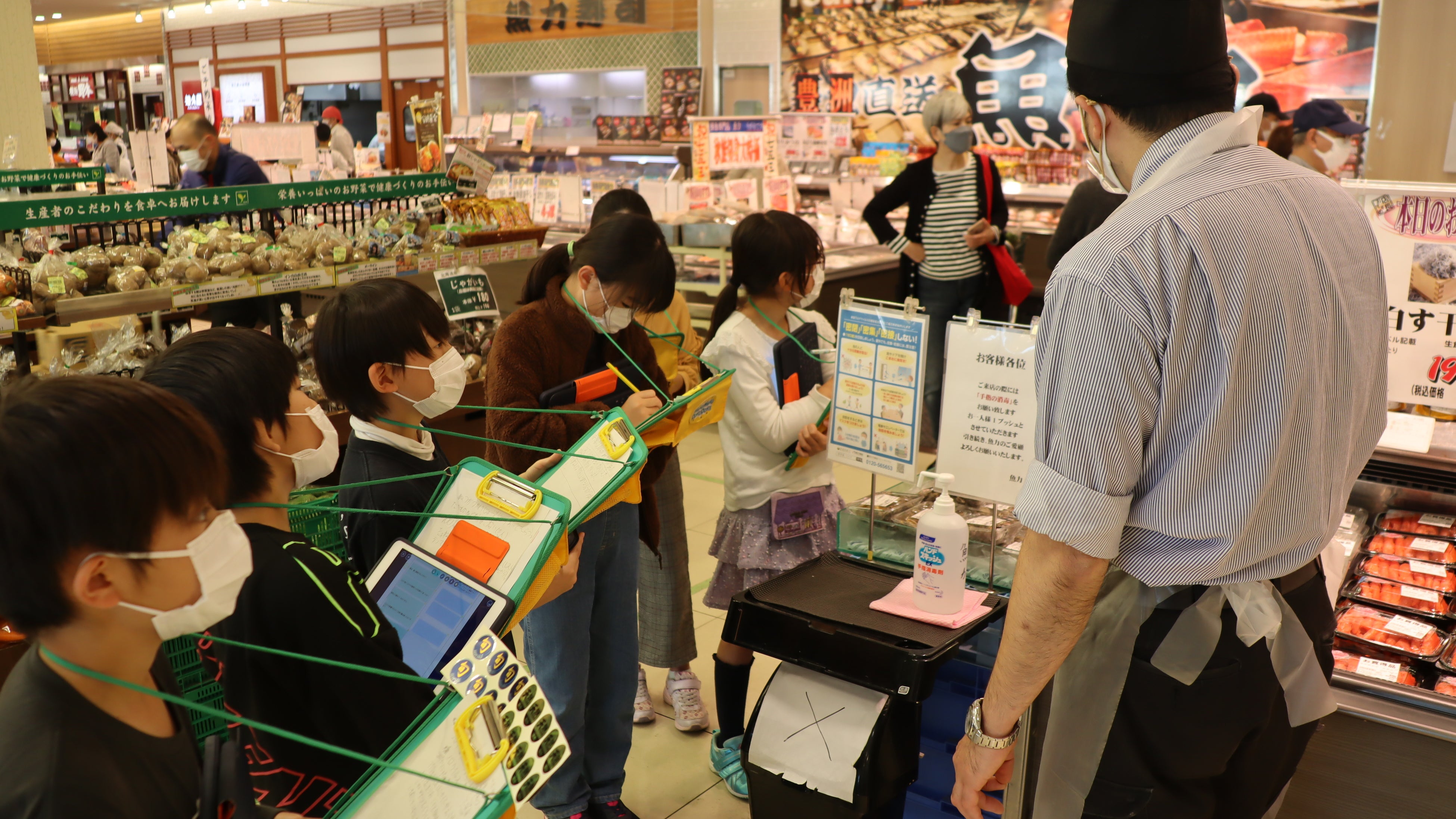 総合学習の授業の一環で、児童たちは“衛生対策調査隊”として、近隣の商業施設への衛生対策の実態取材を行いました。取材を通じて、自分たちが生活する地域でも様々な感染対策が行われていることを発見。人に害の少ないアルコール濃度の消毒剤の使用や飛沫防止シートの設置、テイクアウトの開始など、コロナ禍の前後での衛生対策やサービスにどのような変化があったのか、取材での気づきをプレゼンしました。