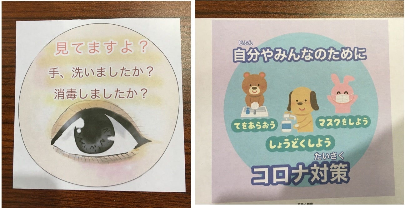 「福育授業」で学んだ正しい衛生対策を、校内からさらに地域へと広めるべく、オリジナルの啓発ステッカーを作成。このステッカーには、1人でも多くの人の衛生意識を高め、自分を守る大切さに気付いてほしいという願いが込められています。動物を用いた可愛らしいものや、「見てますよ」の言葉と共に目をデザインしたドキッとするようなものまで、注意を引くための工夫を凝らしたステッカーの数々を、取材を行った近隣の商業施設などに貼らせてもらいました。地域の方々からは、「小学生が作ったとは思えないくらい本格的」「衛生対策への意識が上がった」といった声が寄せられました。