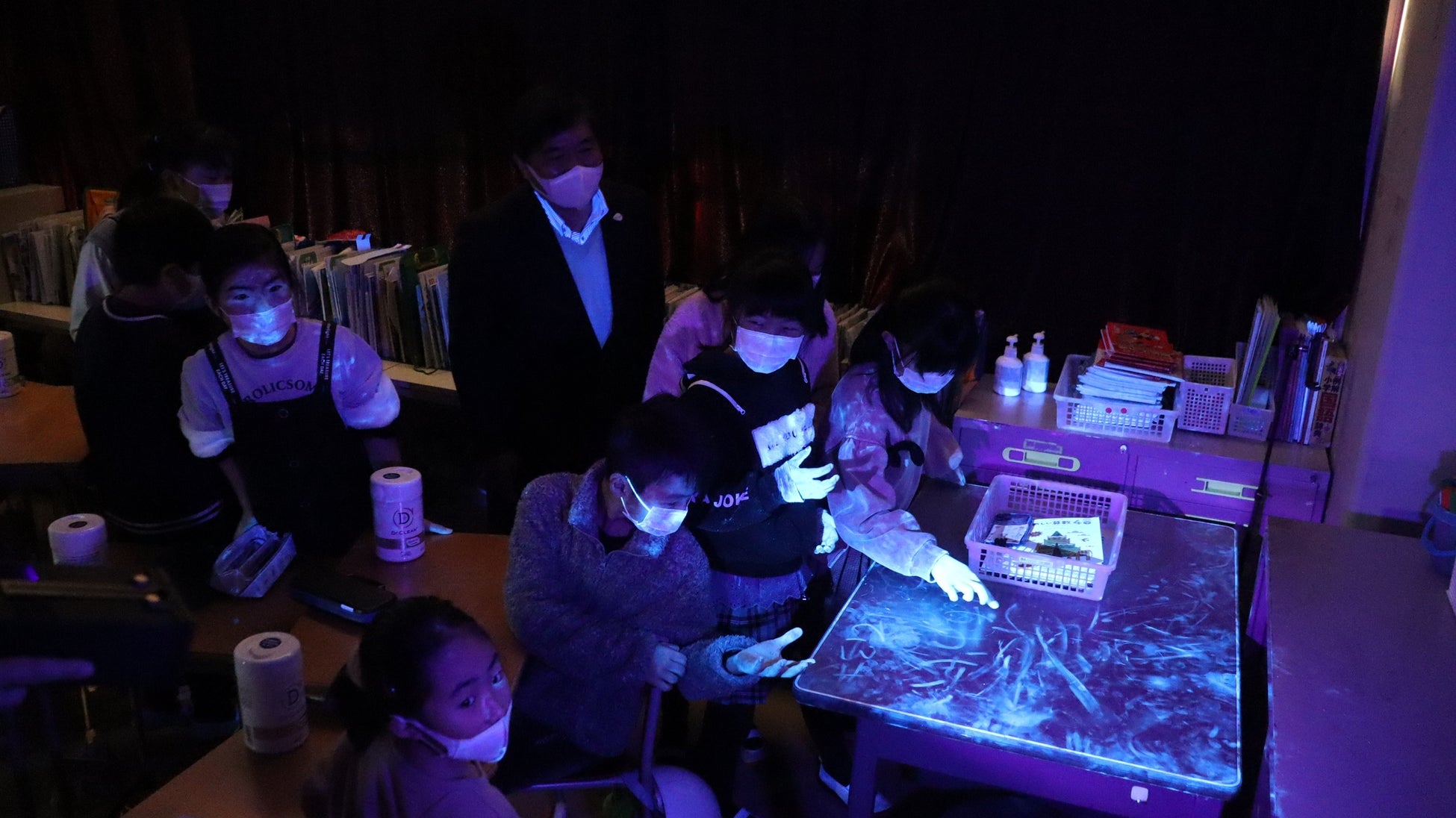 昨年12月、医療環境管理士の松本忠男氏が、清掃を通じて衛生対策を伝える「福育授業」を実施しました。児童たちは、蛍光塗料とブラックライトを用いた汚れの可視化実験や、松本氏が推奨する清掃における正しい拭き方“一方向拭き”を学びました。汚れの可視化実験を通じて、みんながよく触る先生の机や学習用タブレットにたくさんの汚れが付着していることを発見。授業を通して、自分の身近なところに多くの汚れが存在することに気づいたと感想を発表しました。