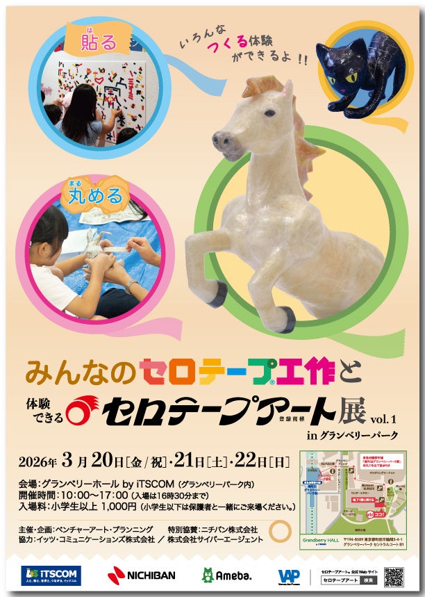ニチバン株式会社(本社:東京都千代田区、代表取締役社長:高津 敏明)のセロテープ®でアート作品を制作する、世界で唯一の「セロテープアート®作家」瀬畑亮(せはた りょう)氏による「みんなのセロテープ®工作と体験できるセロテープアート®展」が3月20日(金/祝)から3日間、南町田グランベリーパーク内グランベリーホール by iTSCOMで開催されます。小さなお子様からお年寄りまで、みんなで一緒に楽しめる、春休みにピッタリの“体験できる”アートイベントです。