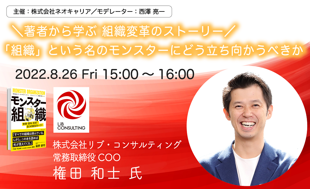 株式会社ネオキャリア(本社:東京都新宿区、代表取締役:西澤亮一、以下ネオキャリア)は、様々な経営課題を解決するためのヒントを得る場として、企業向けのオンラインセミナー『ネオキャリアTOP対談ウェビナー』を開催しております。2022年8月26日(金)は、株式会社リブ・コンサルティング常務取締役COO 権田 和士 氏をゲストにお招きし開催いたします。