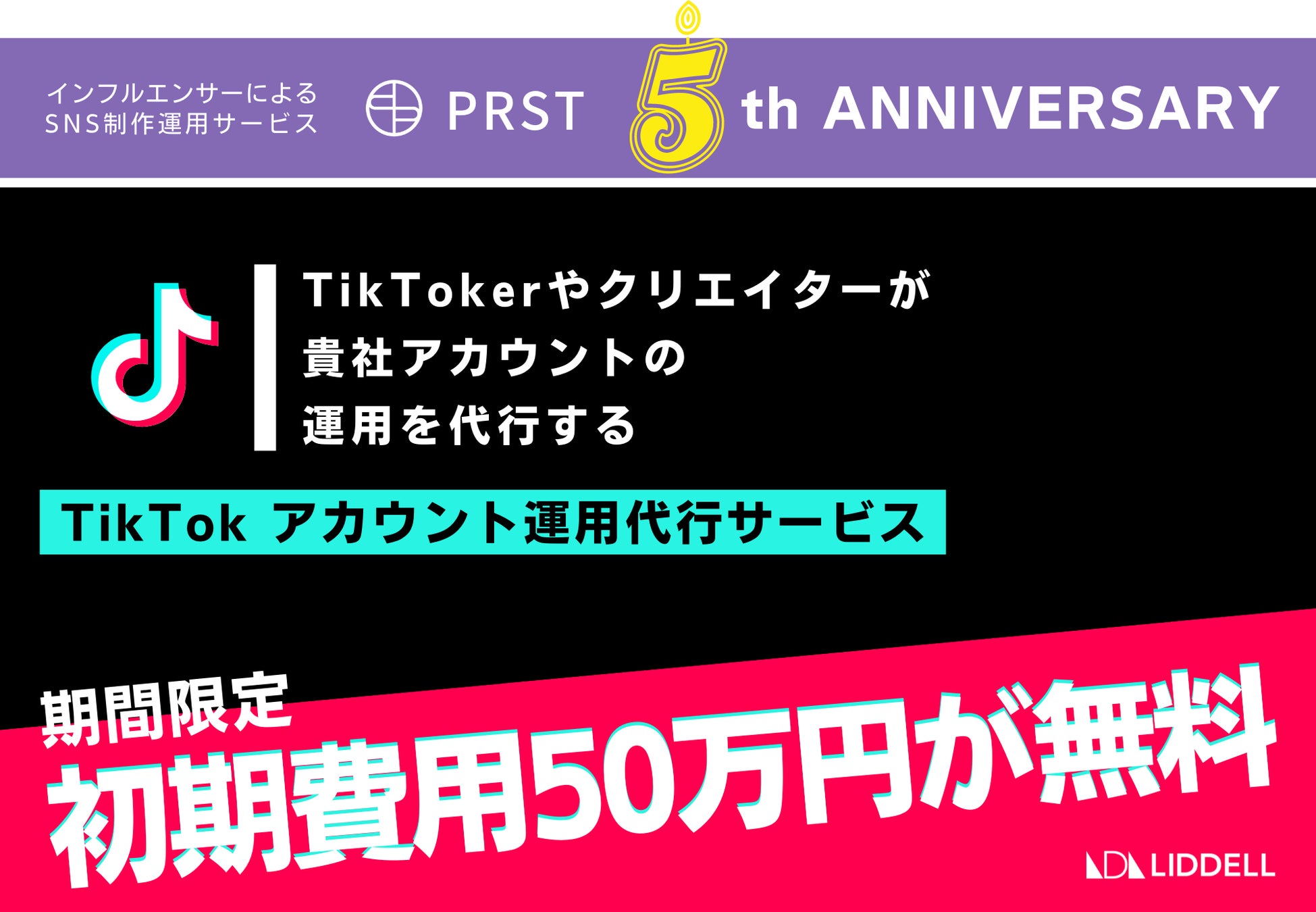 SNS・インフルエンサーマーケティング事業を展開するLIDDELL株式会社 (本社:東京都港区、代表取締役:福田 晃一、以下リデル) は、インフルエンサーによるSNS制作運用サービス『PRST(プロスト)』の5周年を記念し、TikTokerが企業のTikTokアカウントの運用を代行する《TikTokアカウント運用代行サービス》の初期費用(50万円)を無料にするキャンペーンを開始致しました。
